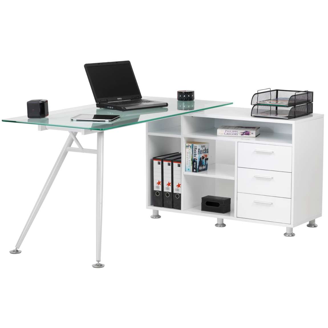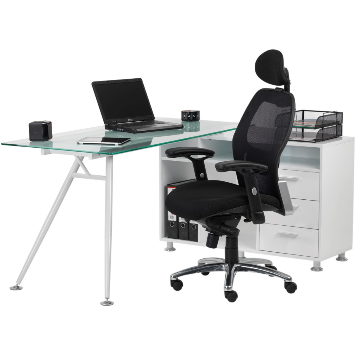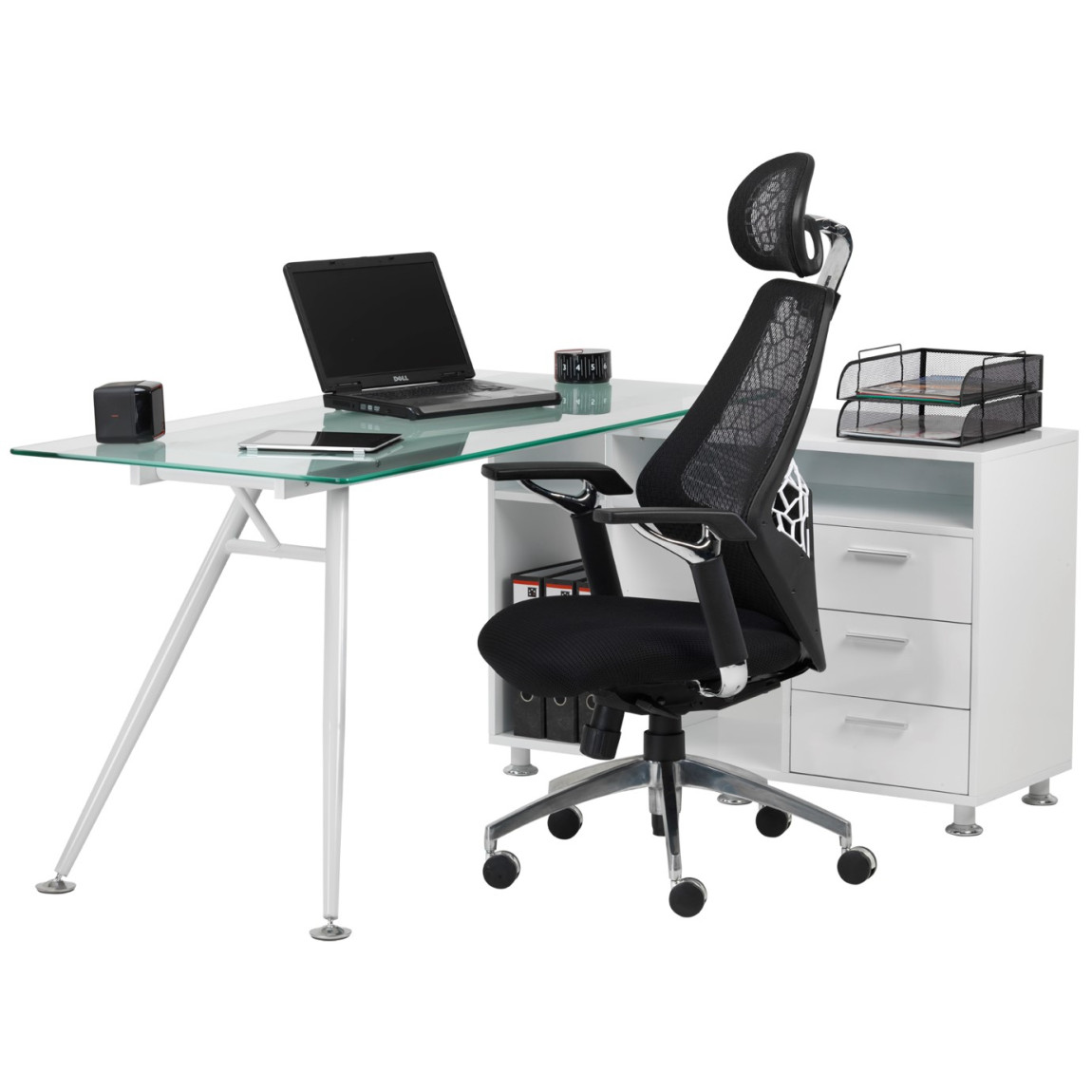 adjustable feet and a tempered frosted glass worktop alongside a white storage