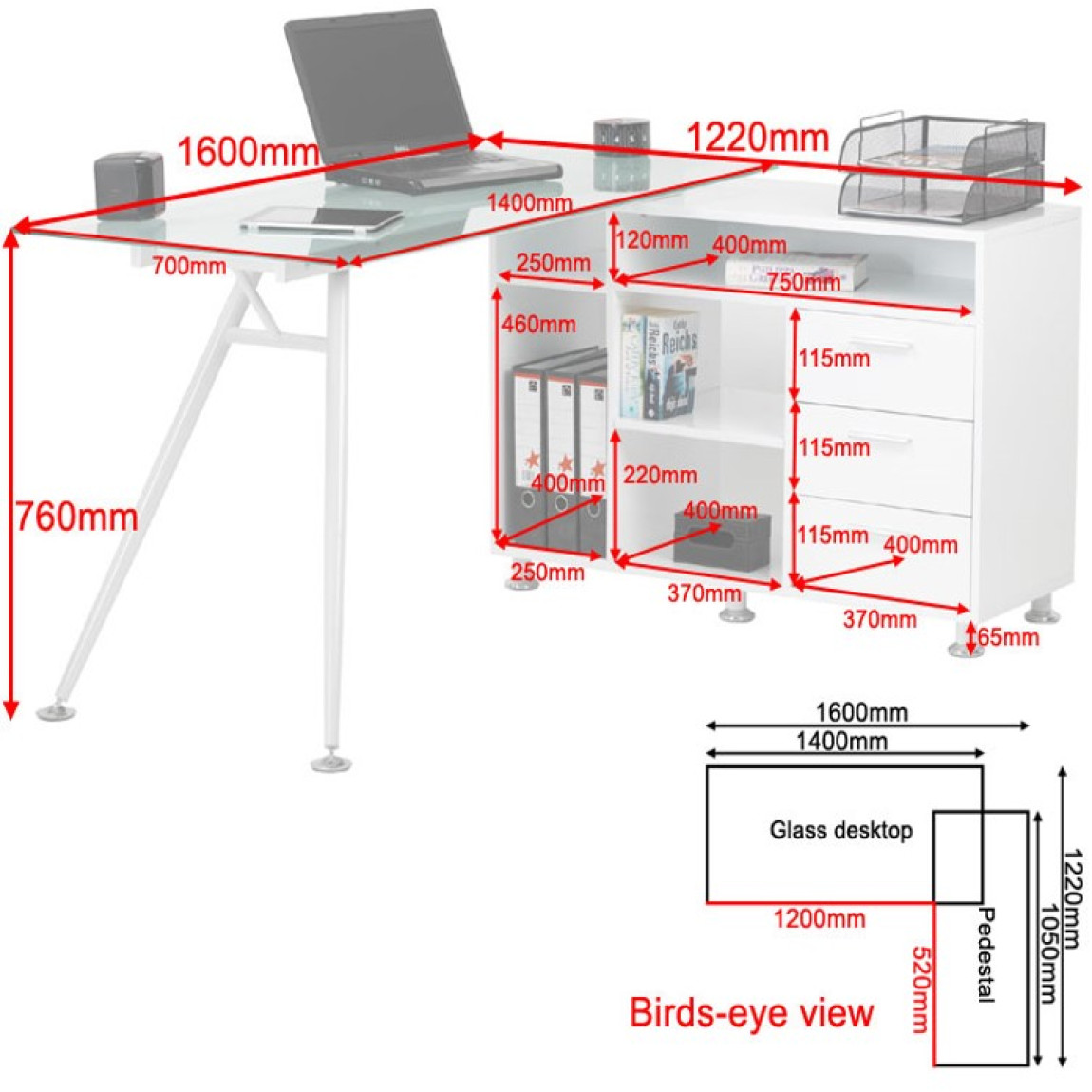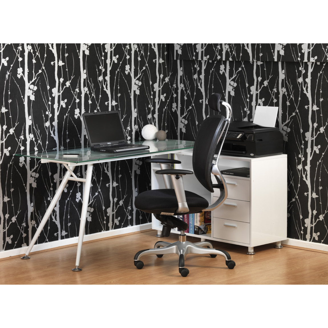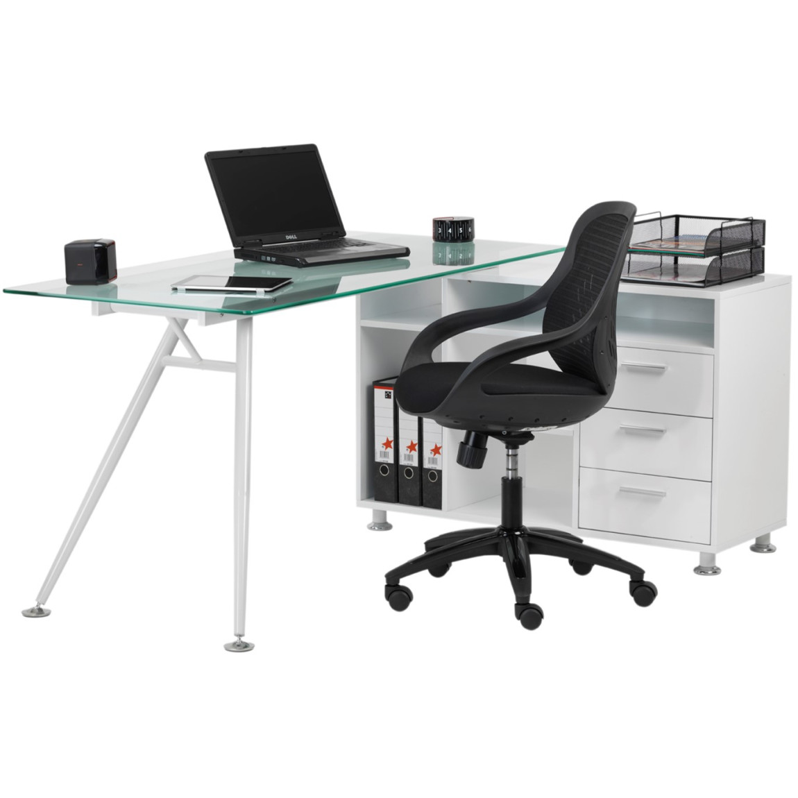 adjustable feet and a tempered frosted glass worktop alongside a white storage