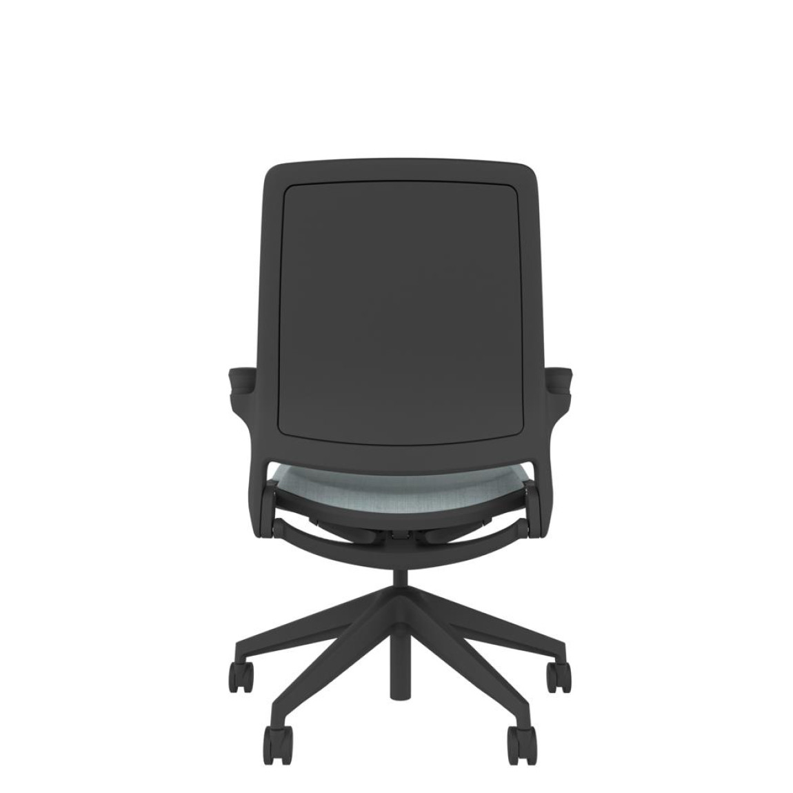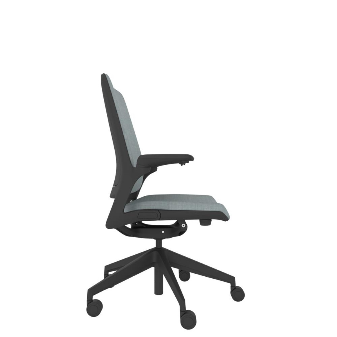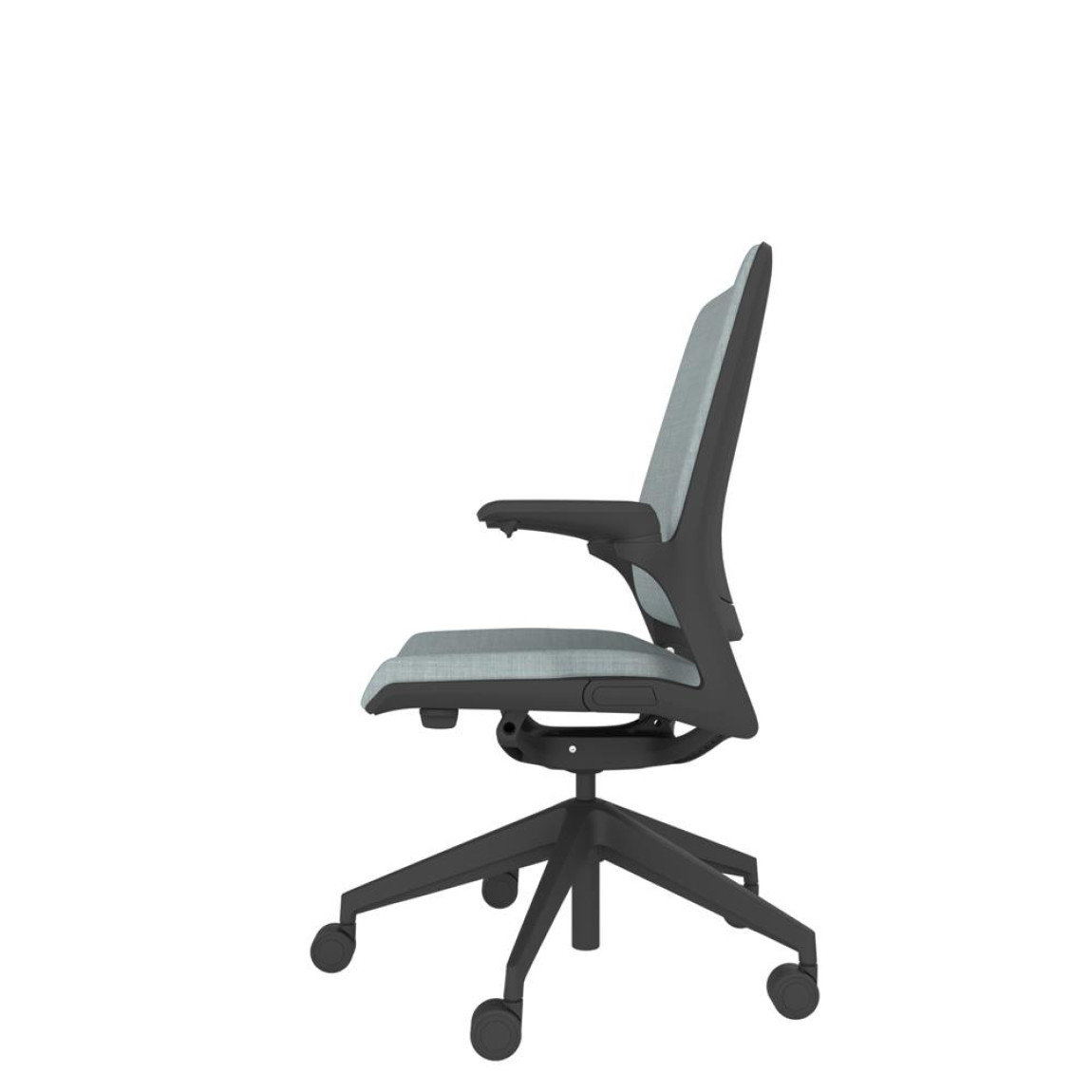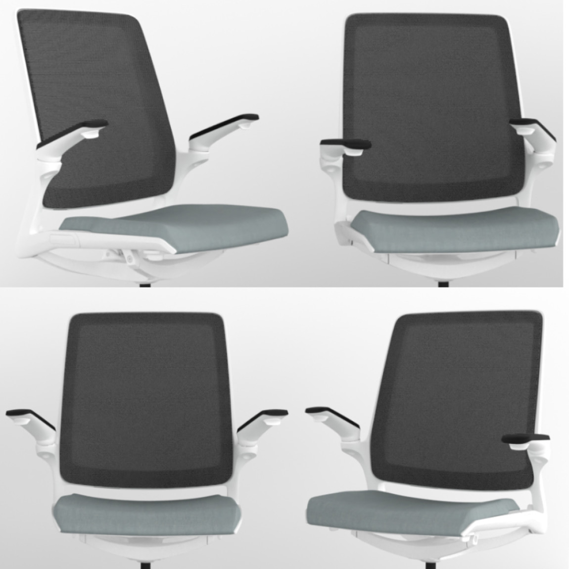 The simple button activated weight balancing movement is unique - simple, smooth and like no other. The hinged frame allows for the anti-knee rise tilting action to naturally follow body movements, improving support and allowing a permanent connection between chair and user. Complementary black and white frame finishes, backrest designs in upholstered or self-supporting mesh, the shade and effect combinations are endless when connecting the chair to the environment. The armrests add another dimension. Height and twist adjustments are not unusual, but combine that with a tilting angle feature and support is created for the tablet and mobile device user. Another connection is made.
