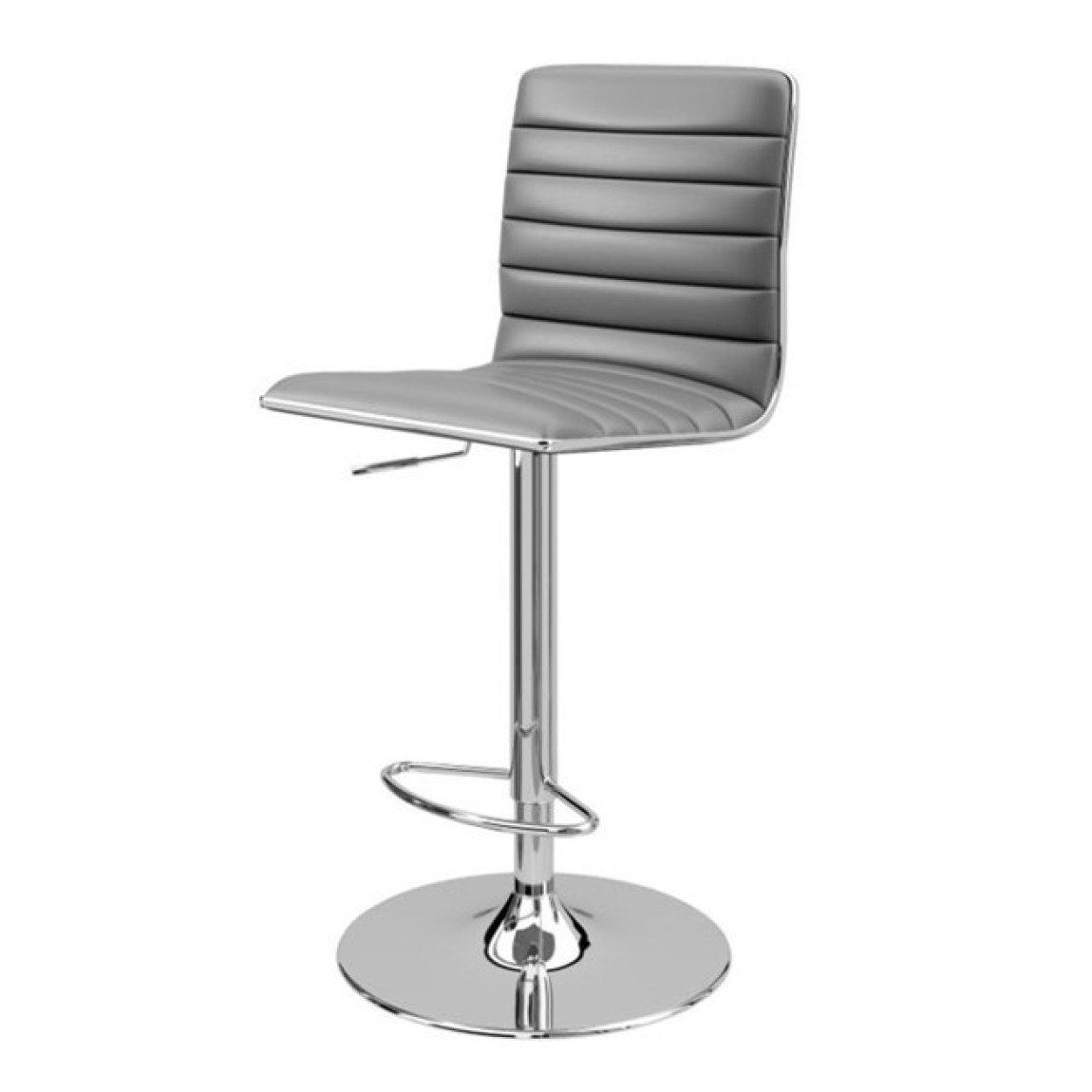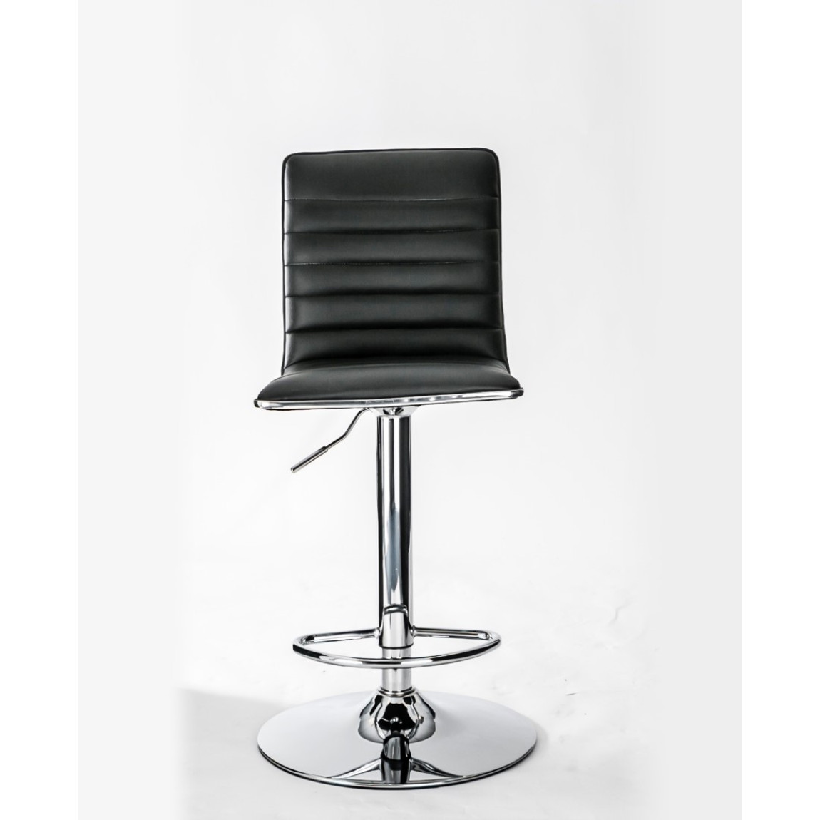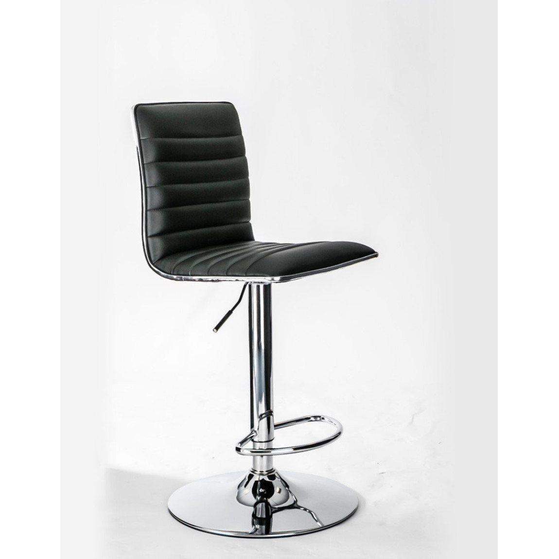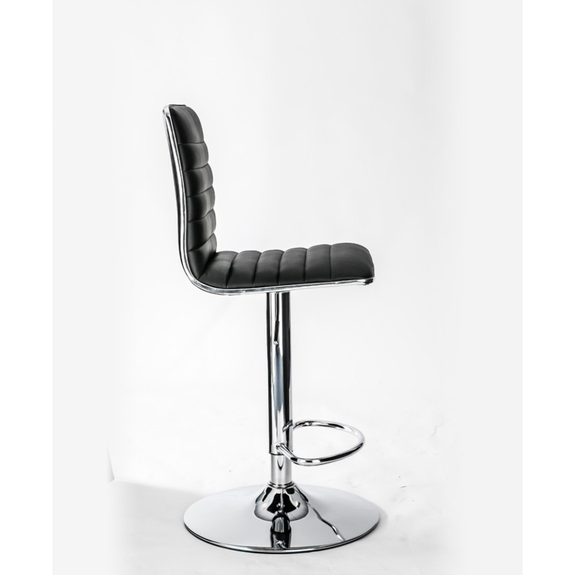The Colby features a ribbed padded high back, outlined in striking chrome, chrome base and footrest, making the Colby Bar stool stylish in any room. The Colby is made in black faux leather, it also has seat height adjustment and 360 degree turning.