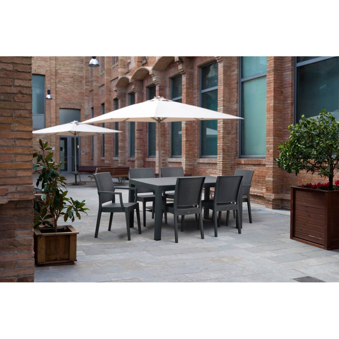 A classic wicker style plastic table that combines cleaning practicality with lasting strength. The Canterbury table has a rattan effect frame with a slatted wood effect surface while benefiting from the strength of polypropylene. This durable table will add a touch of class to any restaurant, hotel, pub, bar or café. Suitable for indoor and outdoor use.