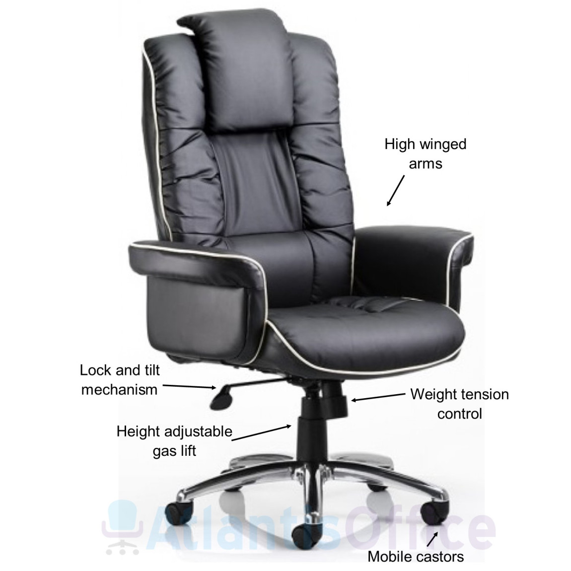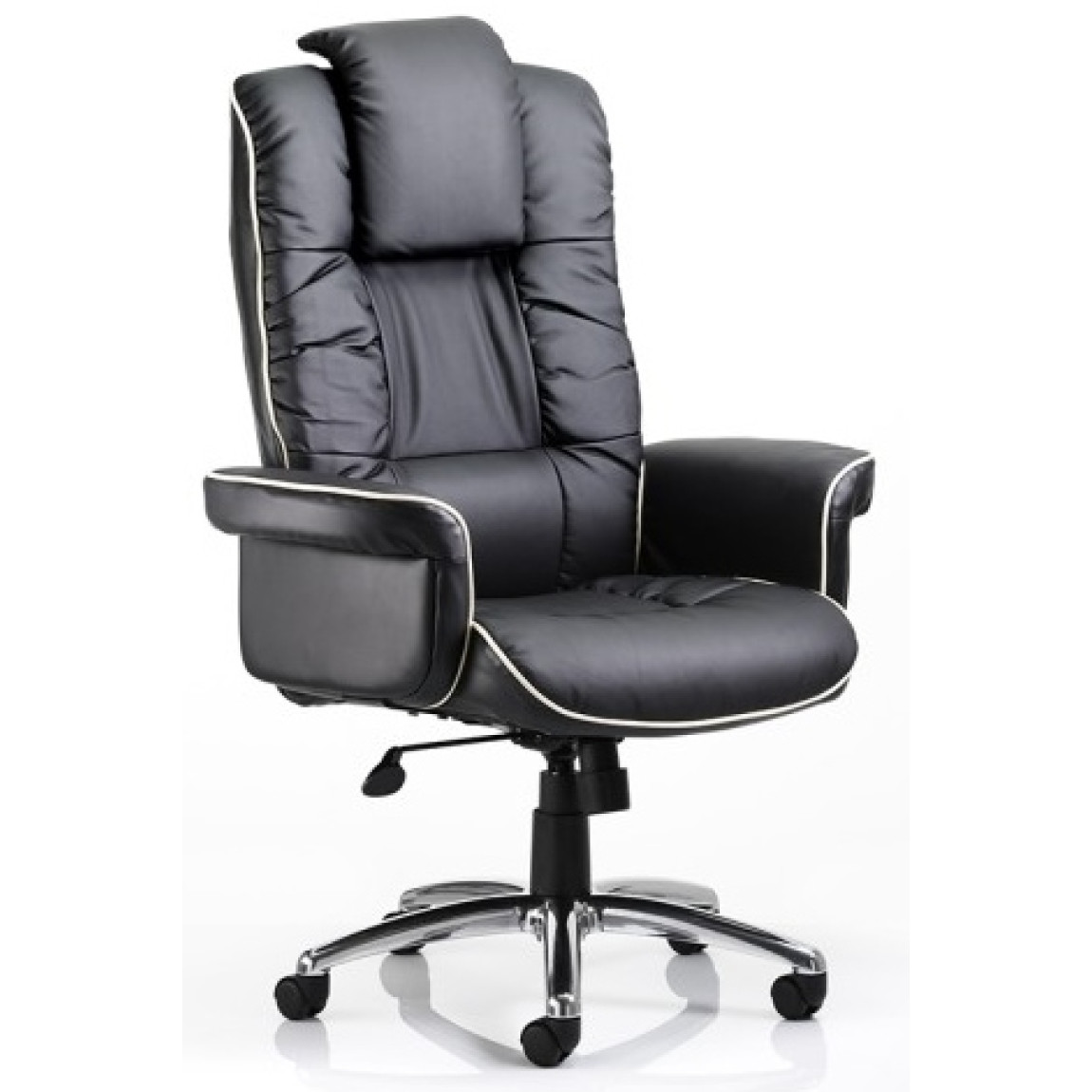 Luxury executive bonded leather armchair with soft fill upholstery. Large padded gull wing armrests and height adjustable headrest. Features a gas seat height adjustment and reclining function with tilt tension control