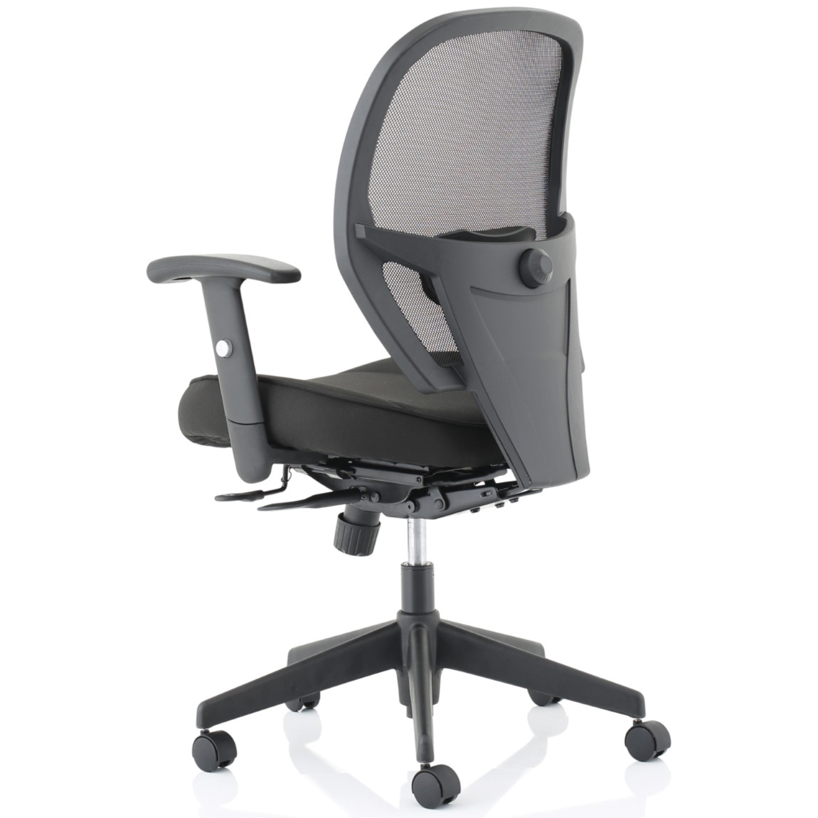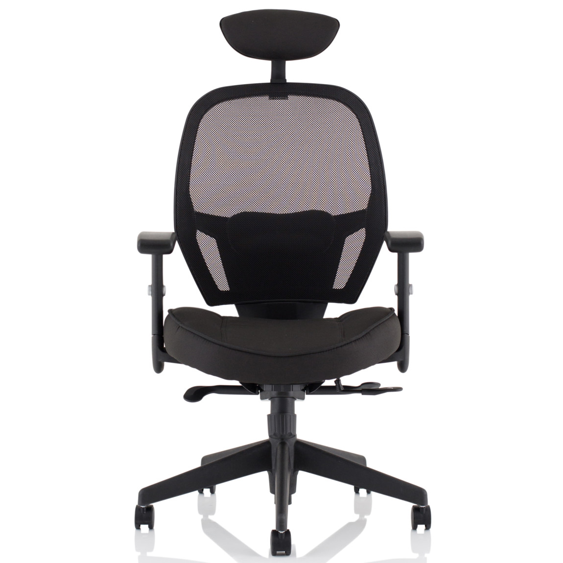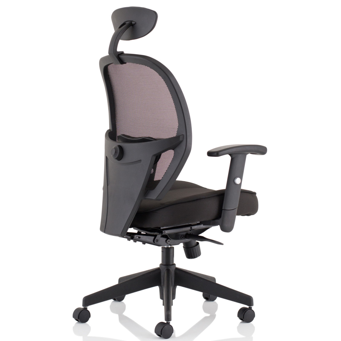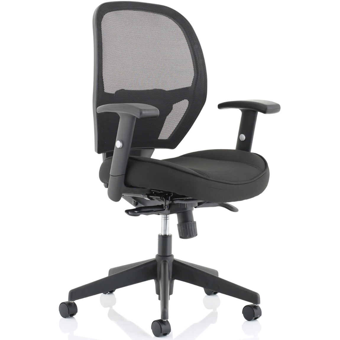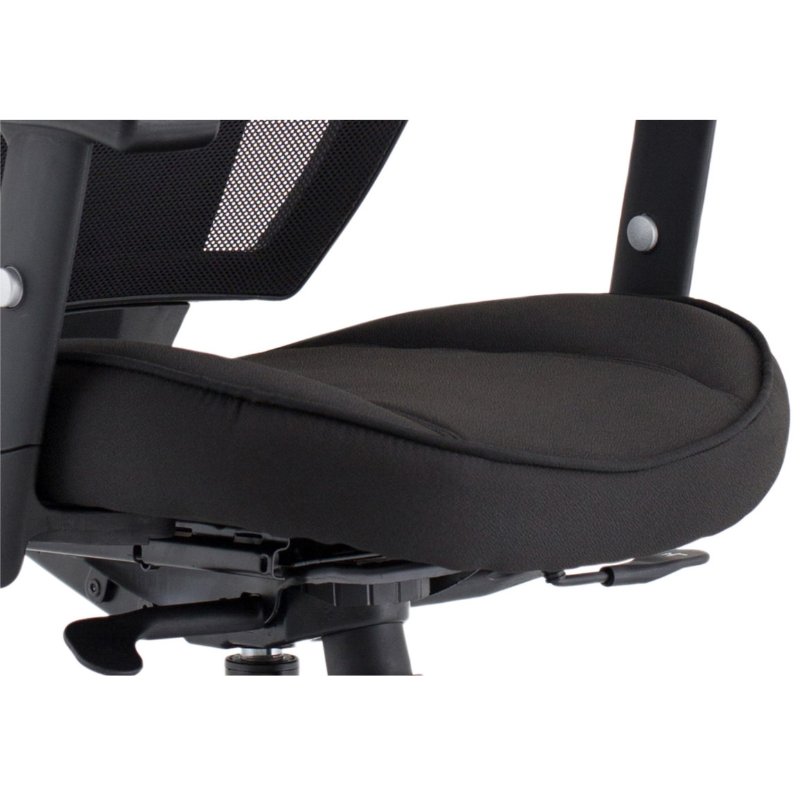 A family of products which offers a black mesh back with a black fabric seat. The curve of the bac..