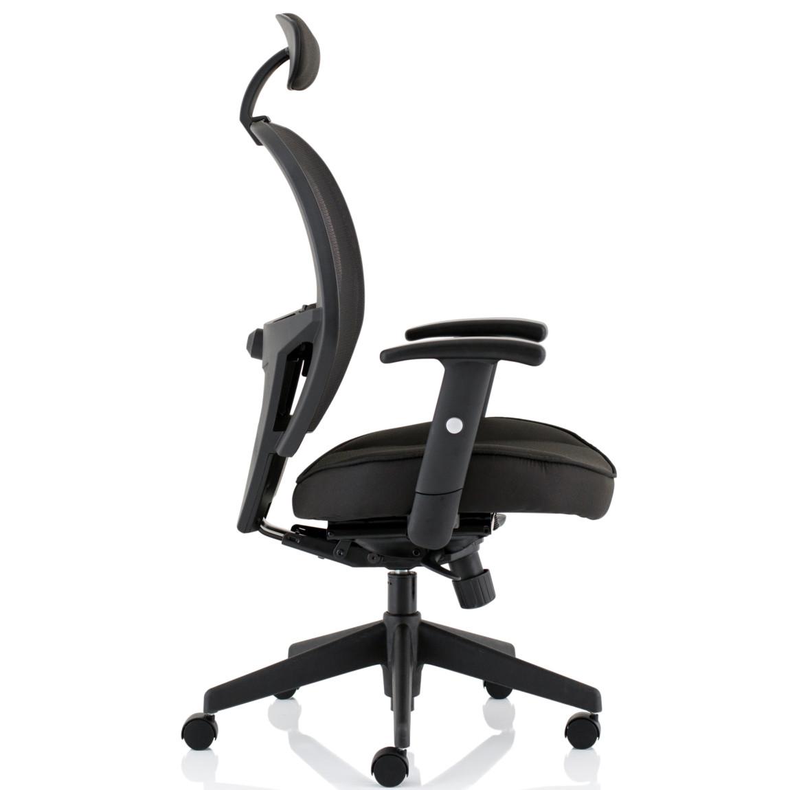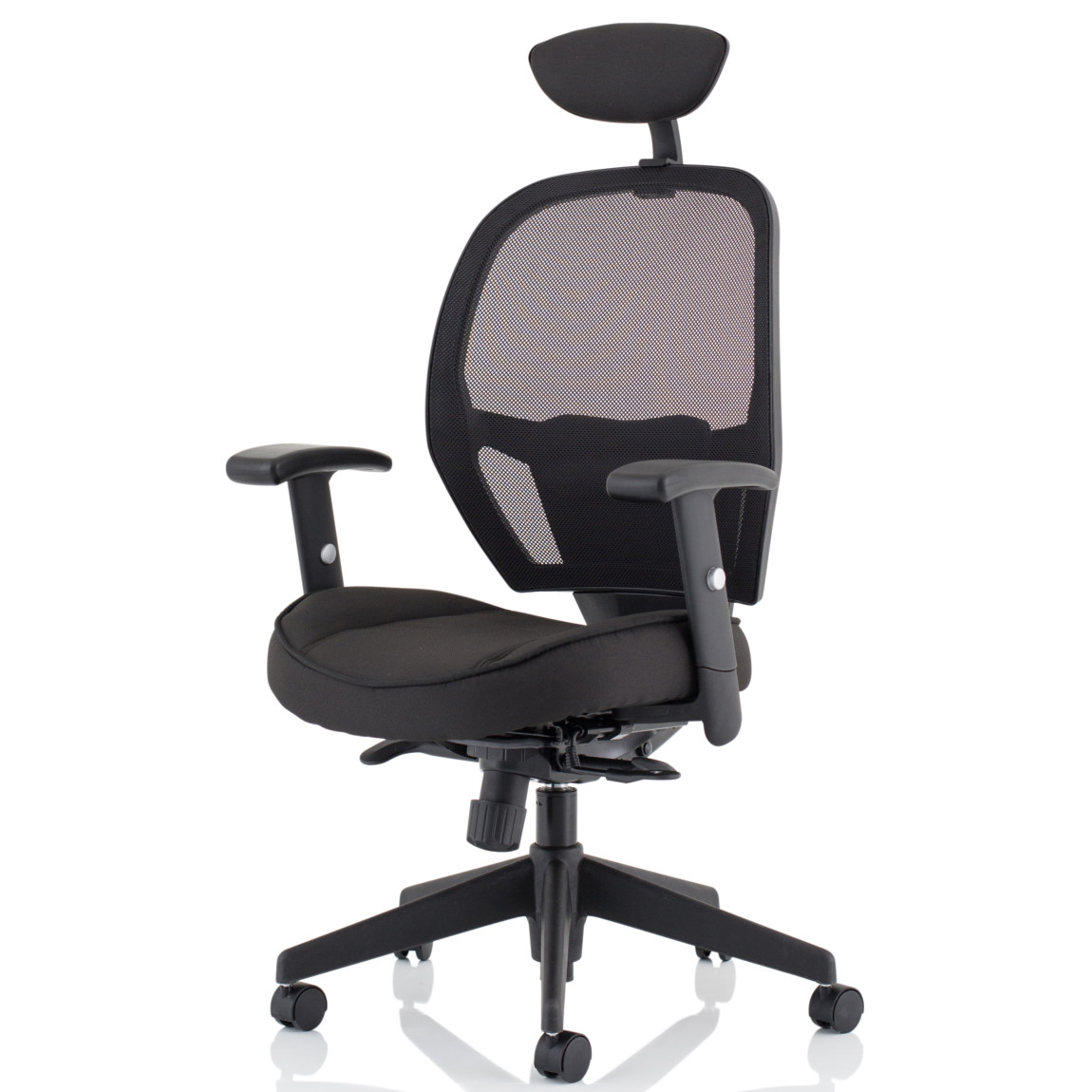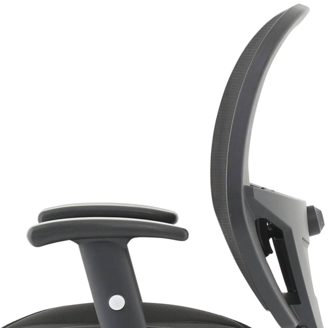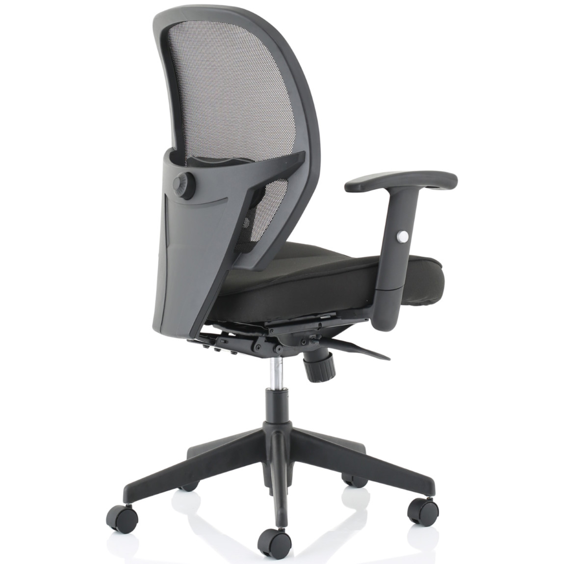 A family of products which offers a black mesh back with a black fabric seat. The curve of the bac..