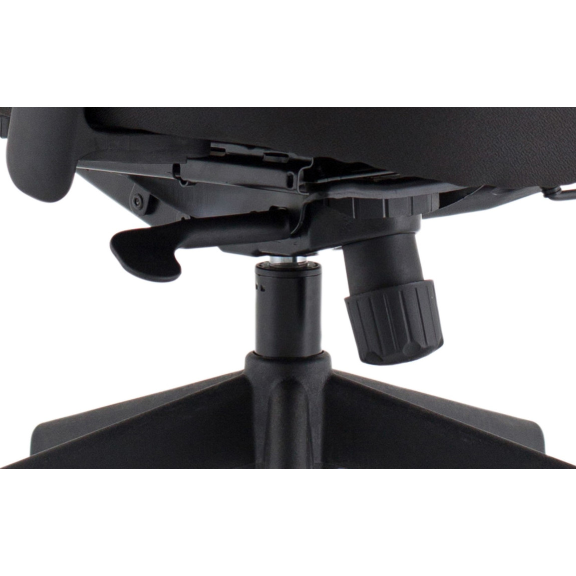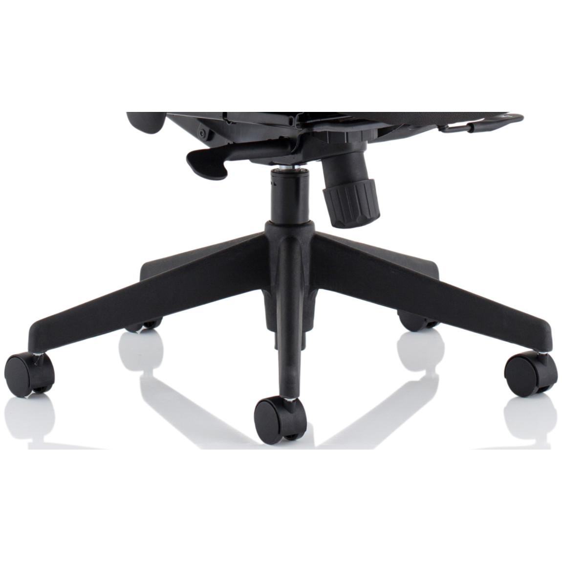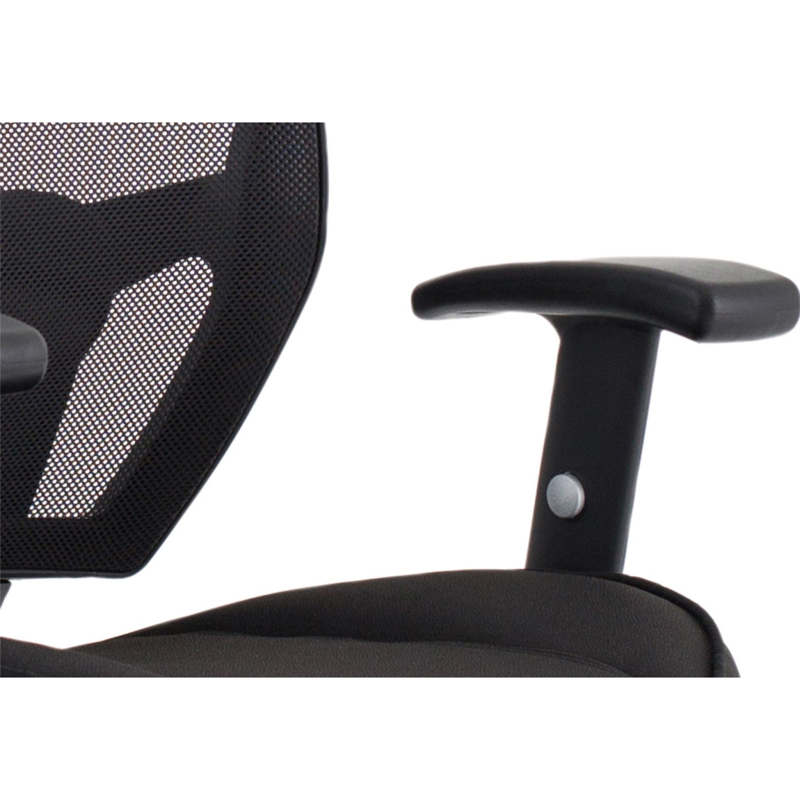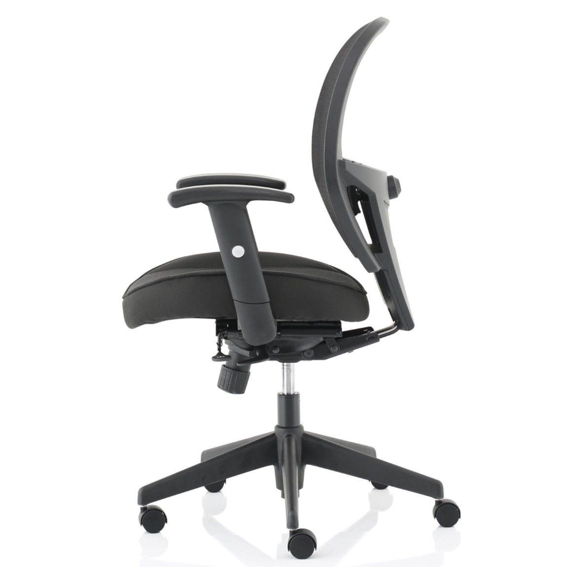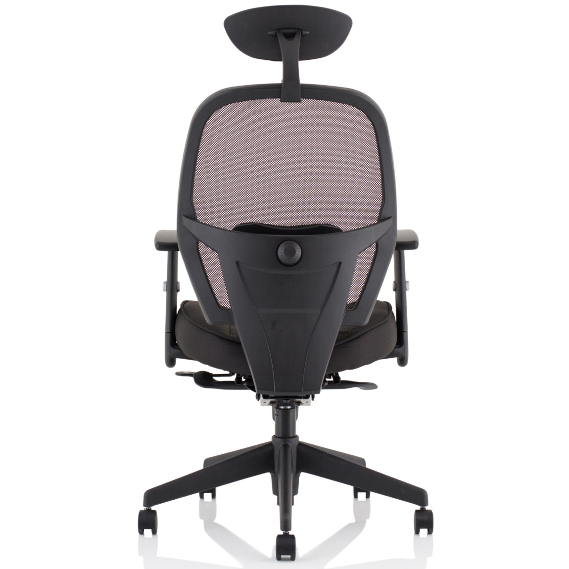 A family of products which offers a black mesh back with a black fabric seat. The curve of the bac..