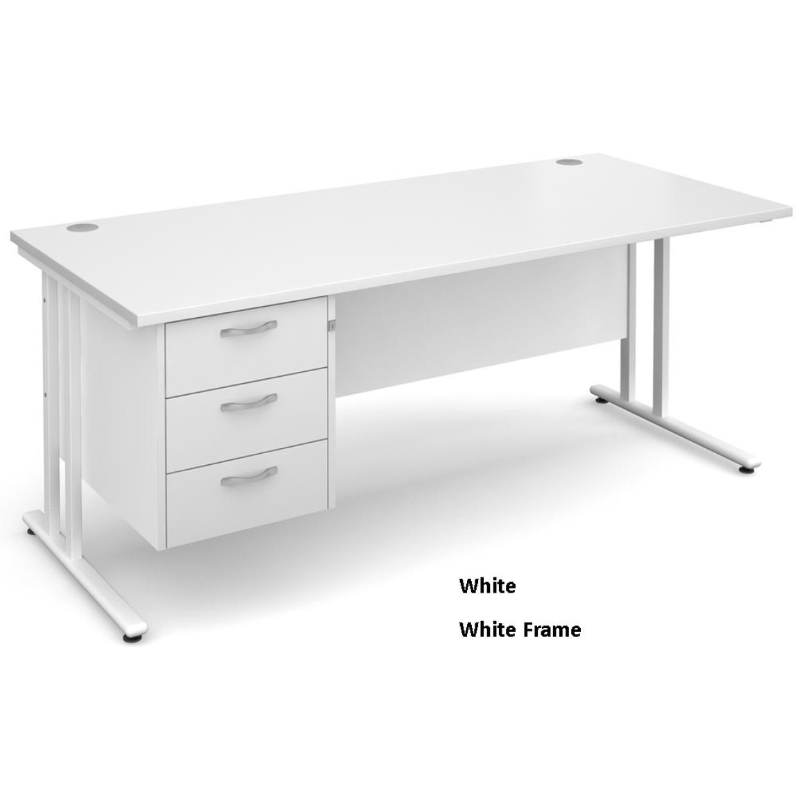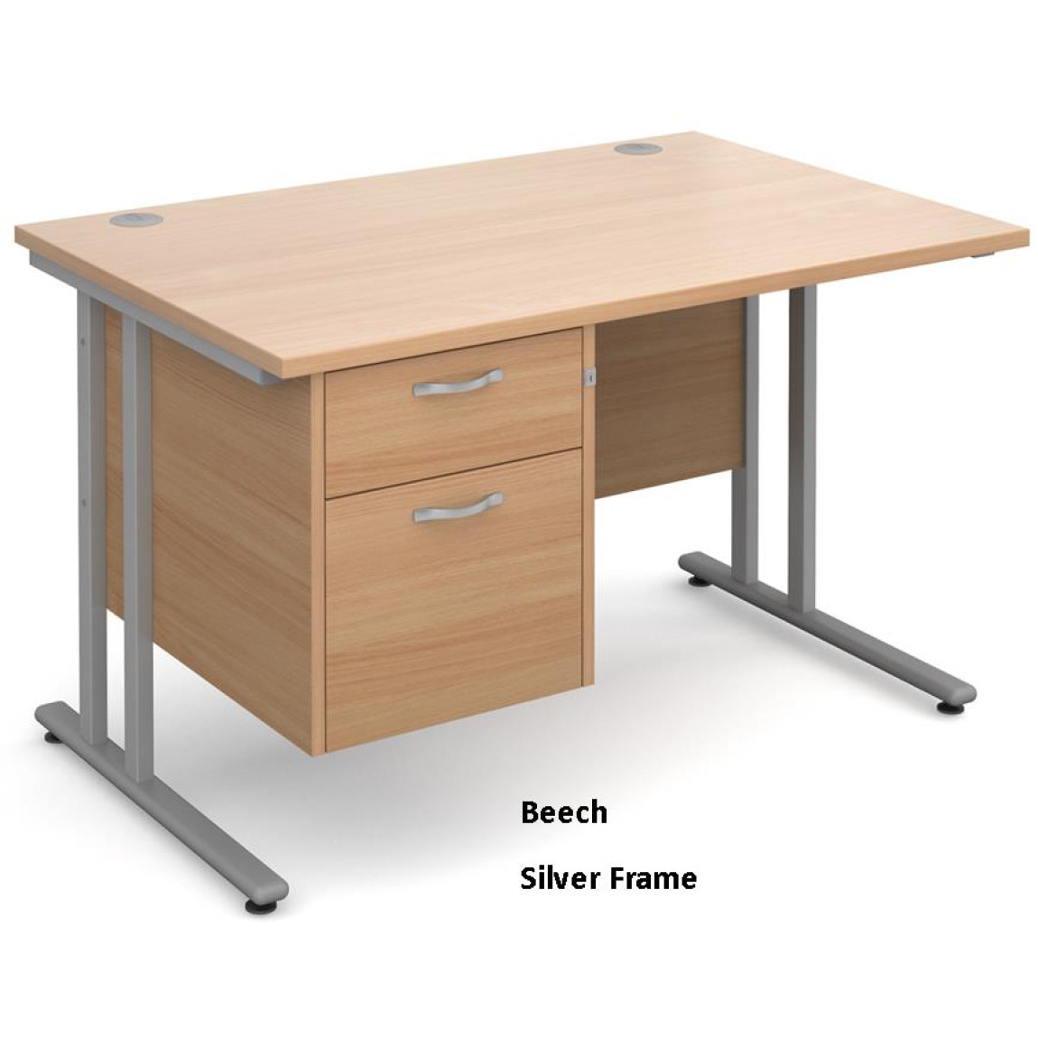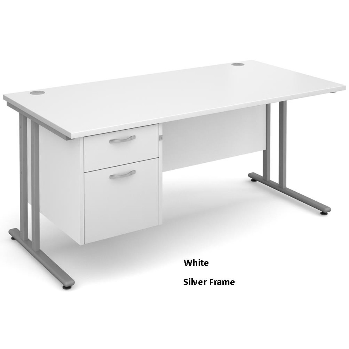 The Maestro 25 Cantilever Frame Straight Office Desk is available in a choice of 4 width options (1200mm wide to 1800mm wide) and is available in Beech, Grey Oak, Oak, Walnut or White complimented by a sturdy double upright cantilever frame which is available in Silver or White. All Width Options offer 2 Cable Management Ports. As well as this, the Maestro 25 Cantilever Frame Straight Desk offers an 18mm thick back modesty panel, feet levellers and 25mm thick tops. The Maestro 25 Cantilever Frame Desk with 1 Pedestal offers either a 2 drawer pedestal (1 Filing Drawer which accepts A4 or Foolscap Files and 1 Stationary Storage Drawer) or the 3 drawer pedestal which offers 3 stationary drawers.