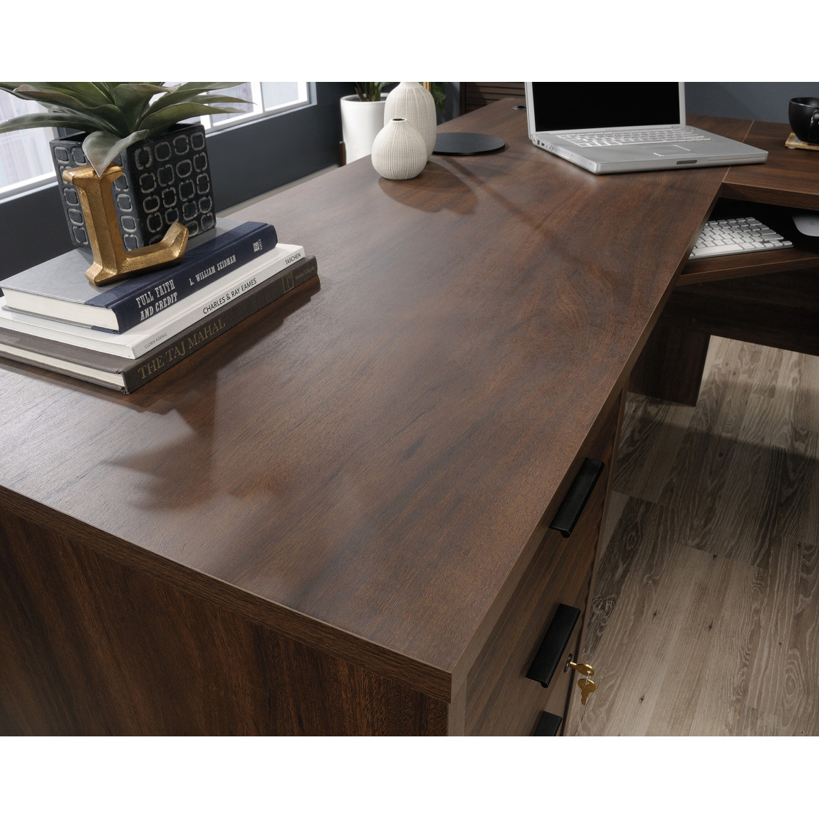 - Home office L-shaped desk in spiced mahogany finish