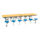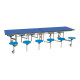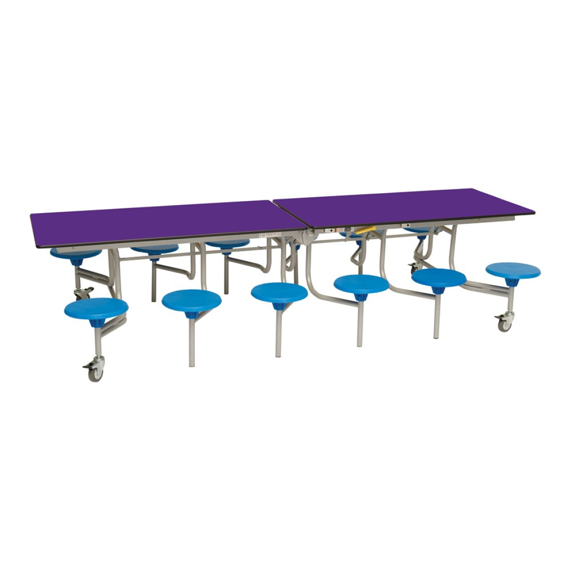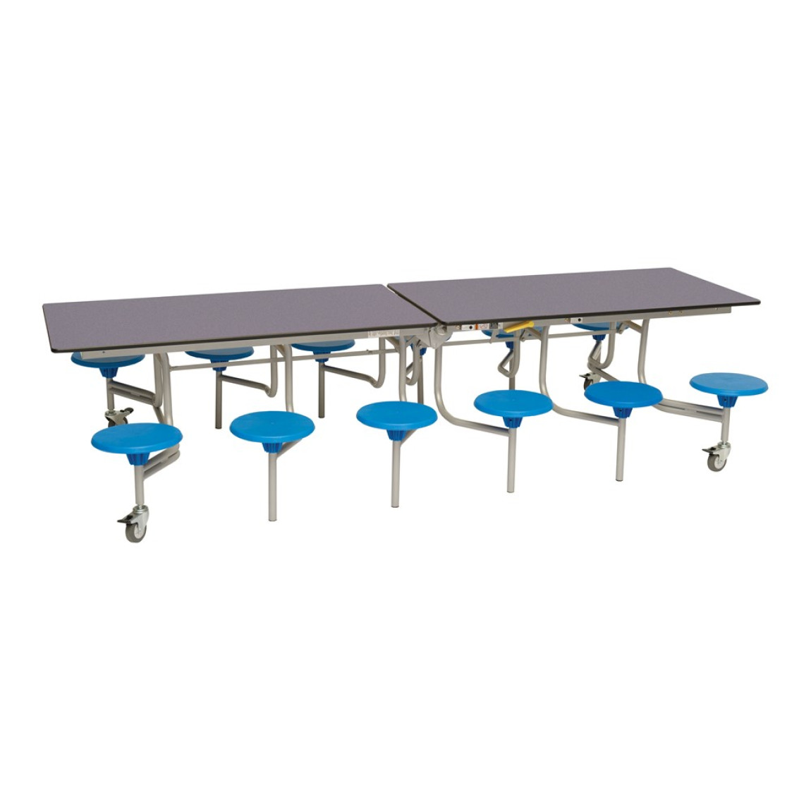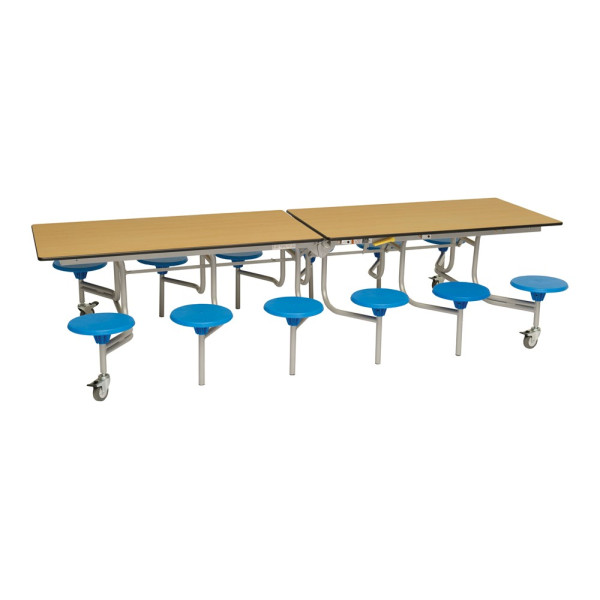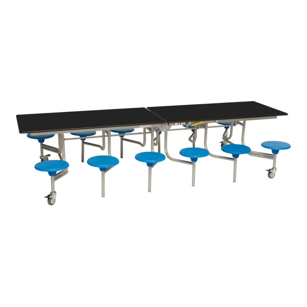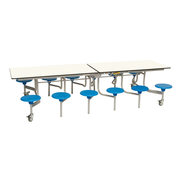 Our mobile folding tables make it quick and effortless to convert multi-use halls into dining areas without the need for heavy lifting. A perfect solution for busy schools and canteens. The twelve seat dining unit is the most popular configuration amongst schools with fourteen table top colours to choose from and two height options. The sturdy and flexible design is functional, practical and easy to use.