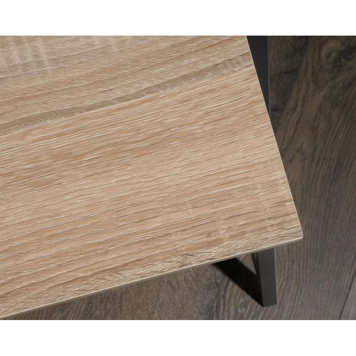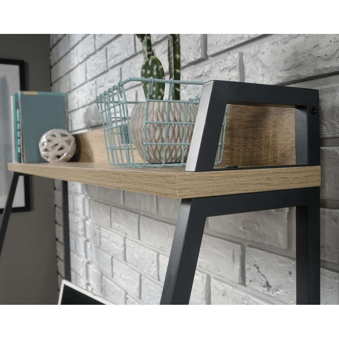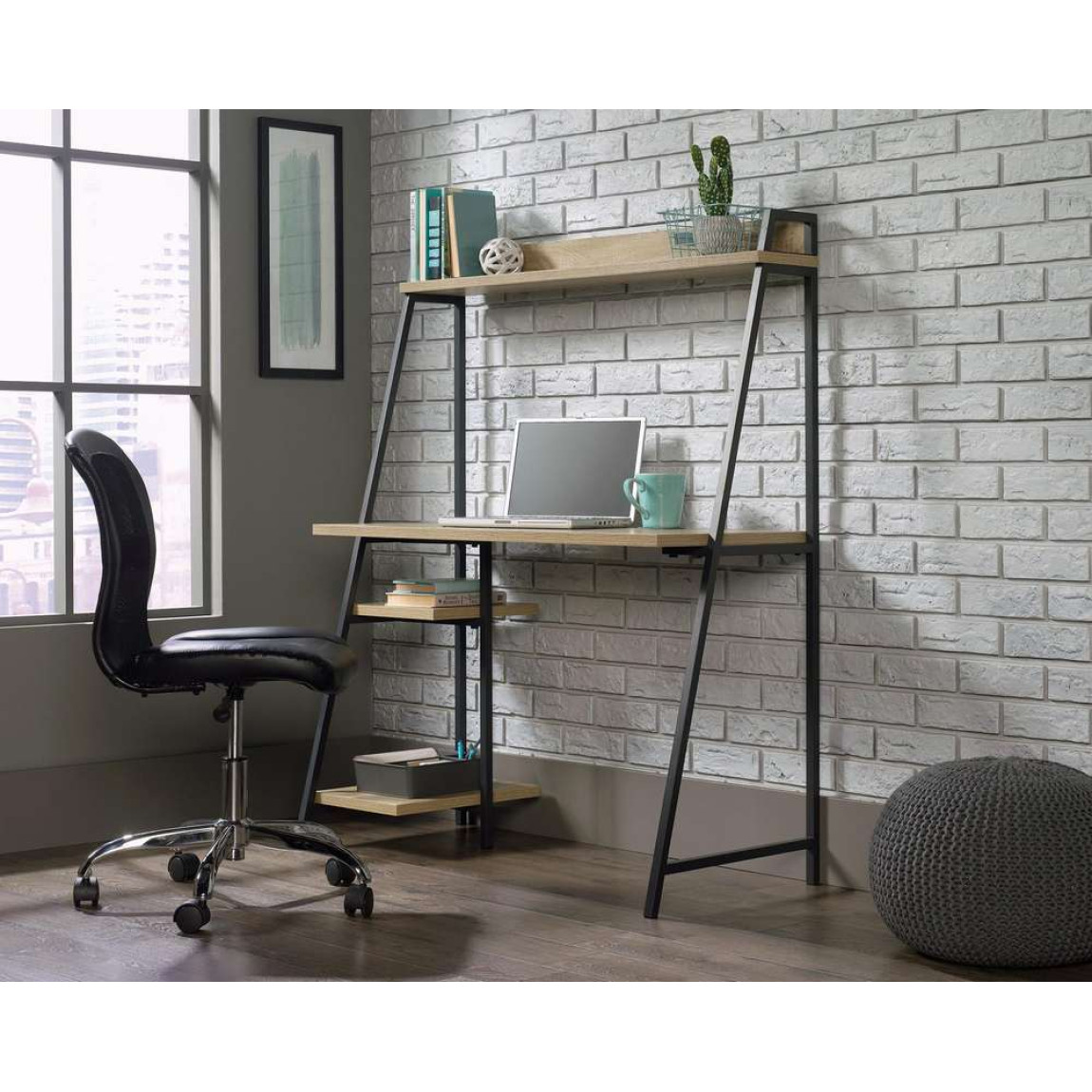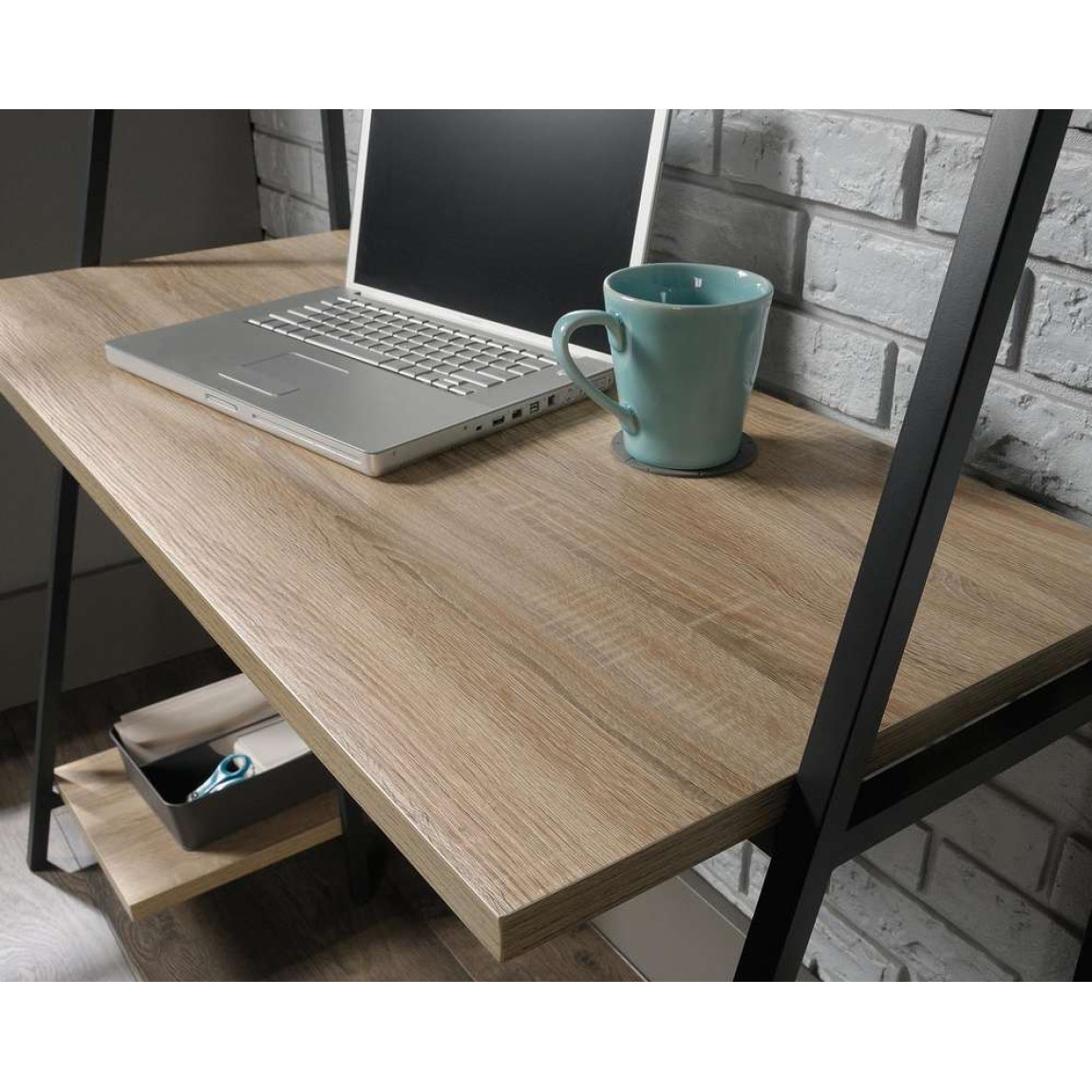 - Home office industrial style bench desk with shelf in Charter Oak finish