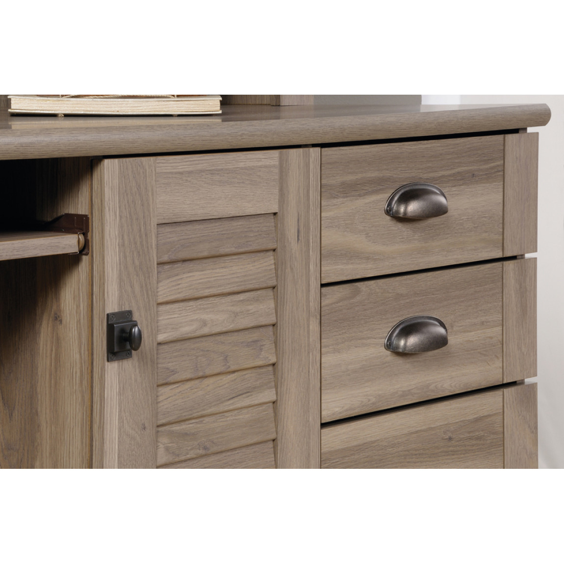 The Louvre Hutch Desk is ideal for use in any home office environment. The Louvre boasts elegance and style with its Salt Oak finish along with the metal handles and provides ample storage with the 2 stationary drawers, a filing drawer and a large selection of storage cubbyholes along with a lower storage shelf. The Louvre also offers a slide out keyboard shelf with strong and sturdy metal runners and safety stops.