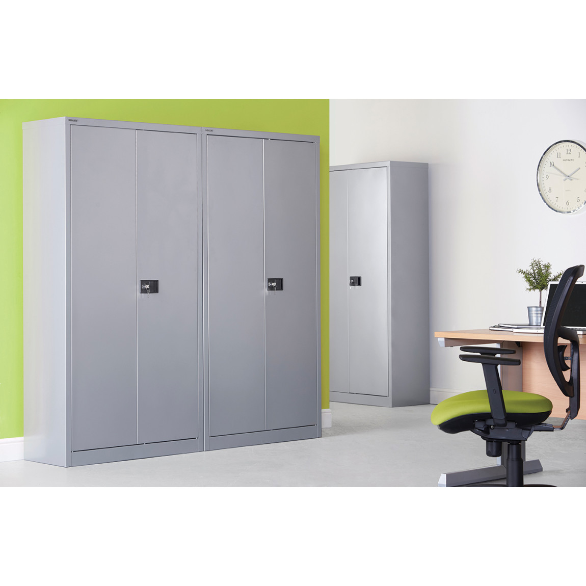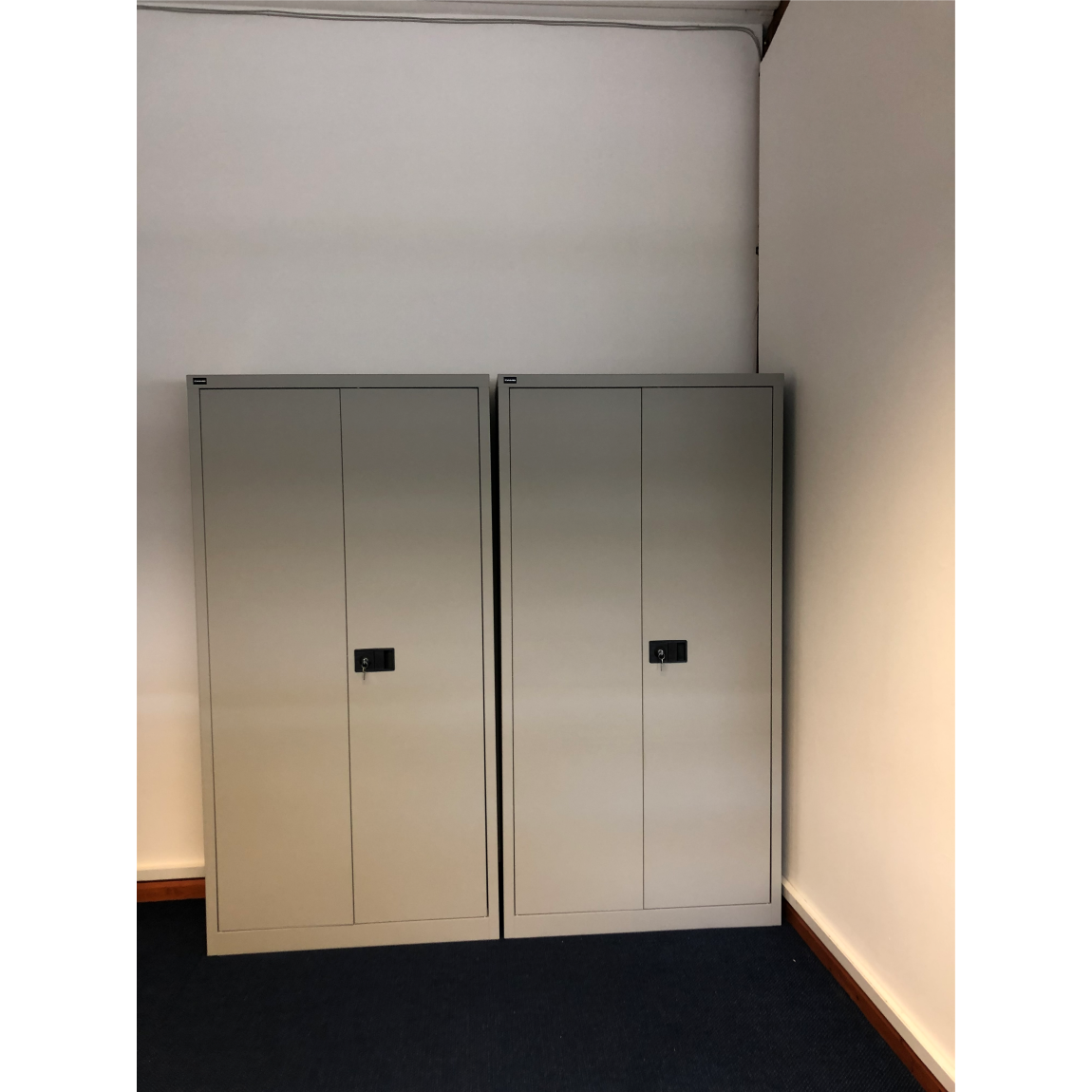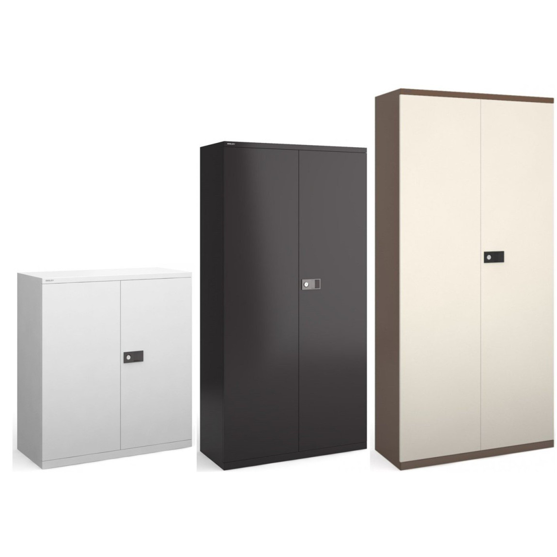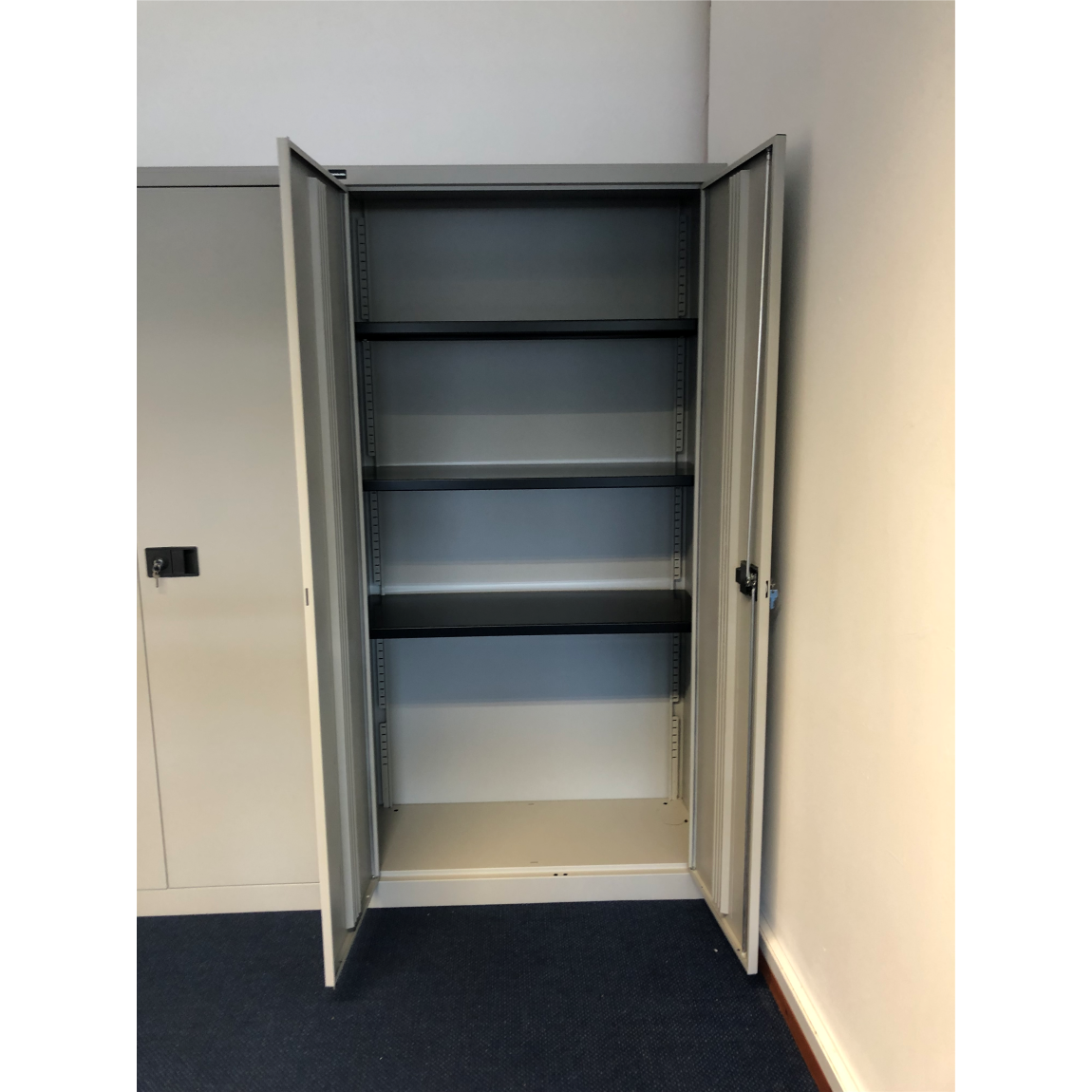 Contract Double Door Steel Cupboards offer an economical solution to today’s office storage requirements. These are available in three heights, 1000mm and 1806mm, three colours, Black, Silver or Coffee & Cream. All contract storage cupboards are 914mm Wide. The doors open through 180 Degrees allowing the use of roll out fitments, the lock consists of a two-point locking system with a flush twist handle and two keys. Comes Built and supplied with Shelves.