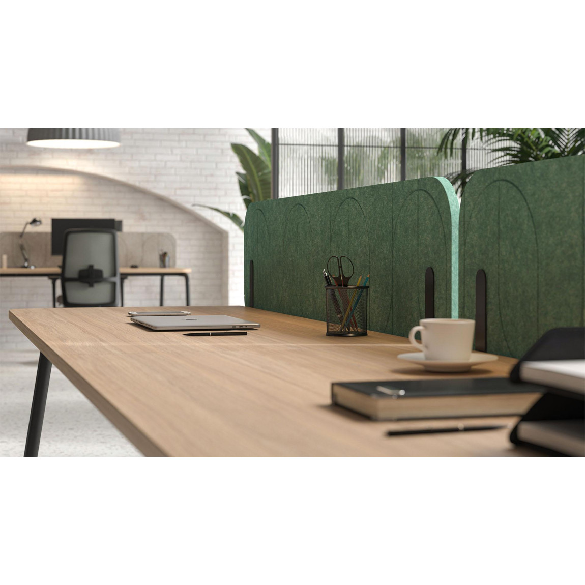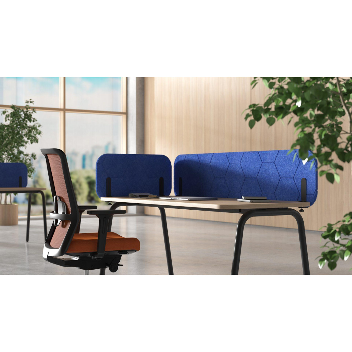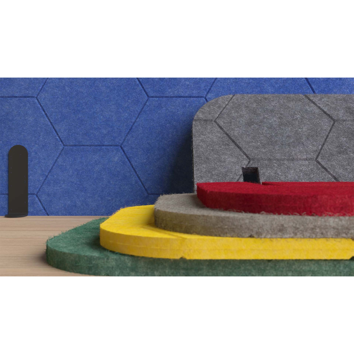 This sustainable material possesses excellent sound absorption properties. The porous structure ensures efficient absorption of medium to high frequency noise despite the low thickness of product, which is relevant when working in the office. PET felt is soft and light, yet strong and durable material is ideal for desk screens. It also has a required degree of fire resistance and meets applicable fire safety requirements. Due to the structure PET felt can be easily cleaned and disinfected.