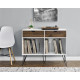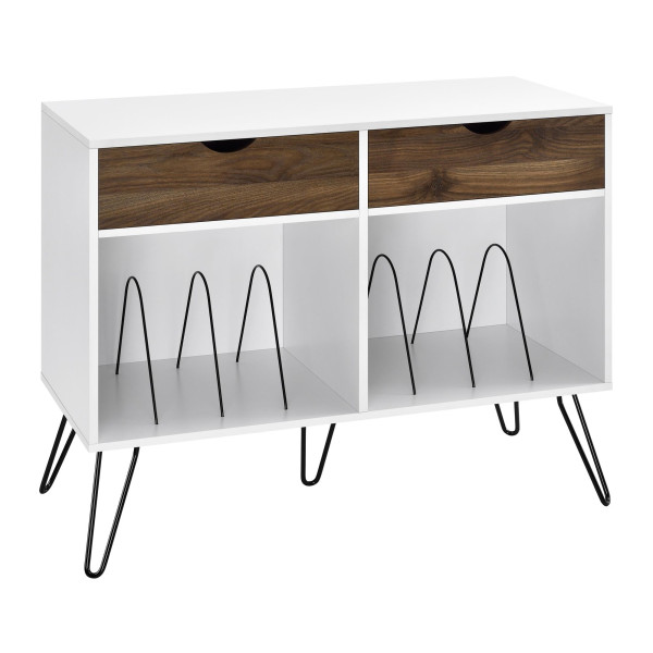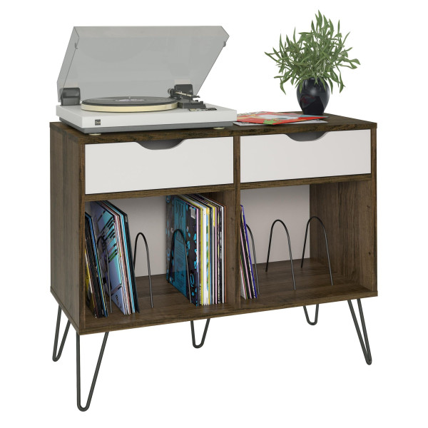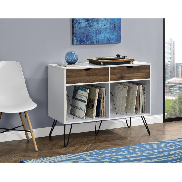 - The double wide Stand offers plenty of space for a record player, speakers and stereo and features 2 large open cubbies with metal dividers to keep your albums upright and organized. Keep your remotes, cassette tapes, and record mats or weights stored away in the 2 spacious drawers