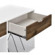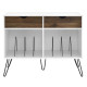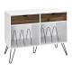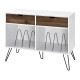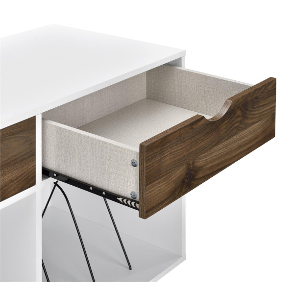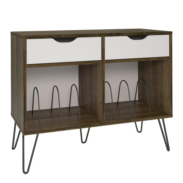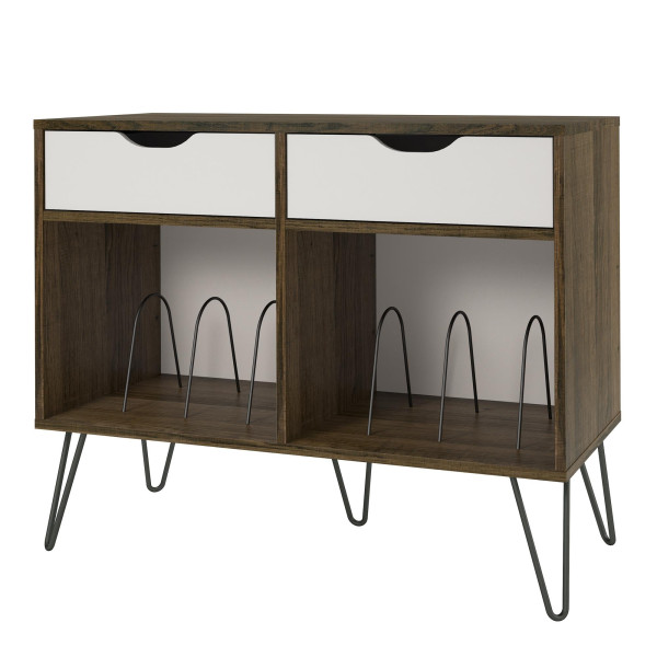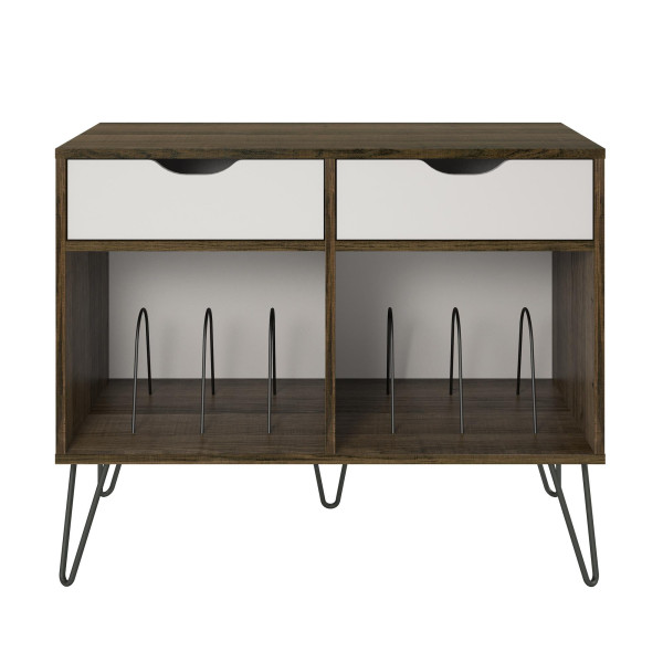 - The white laminated particleboard and MDF chassis offer a strong build that complements the mid-century inspired black metal hairpin legs. The contrasting medium brown woodgrain drawer fronts give the Stand a classic look to add to any style