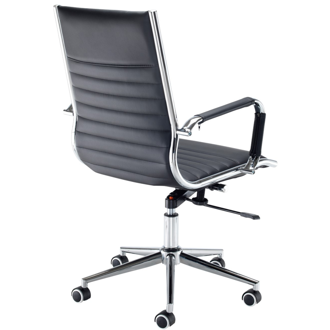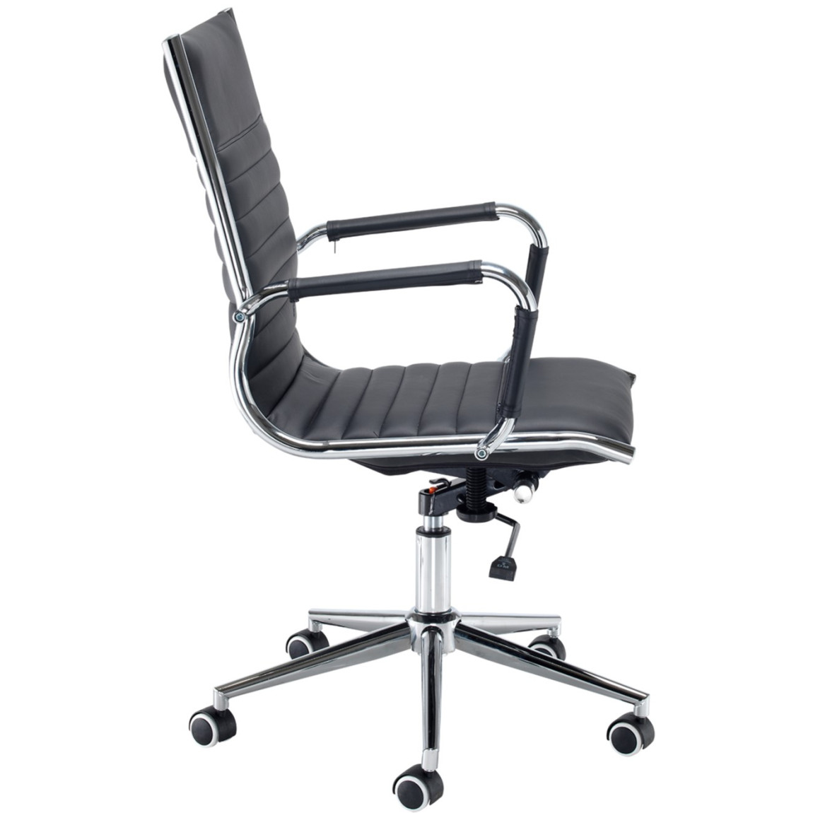 The Batley Black Medium Back Chair is suitable for any commercial or home office, with its ribbed leather faced design it brings both comfort and style to any environment. The Bari features a chrome 5 star base, gas lift adjustment, weight tension control, 115kg weight capacity and standard tilt lock. The Bari is available with a 2 year guarantee and free next day delivery.