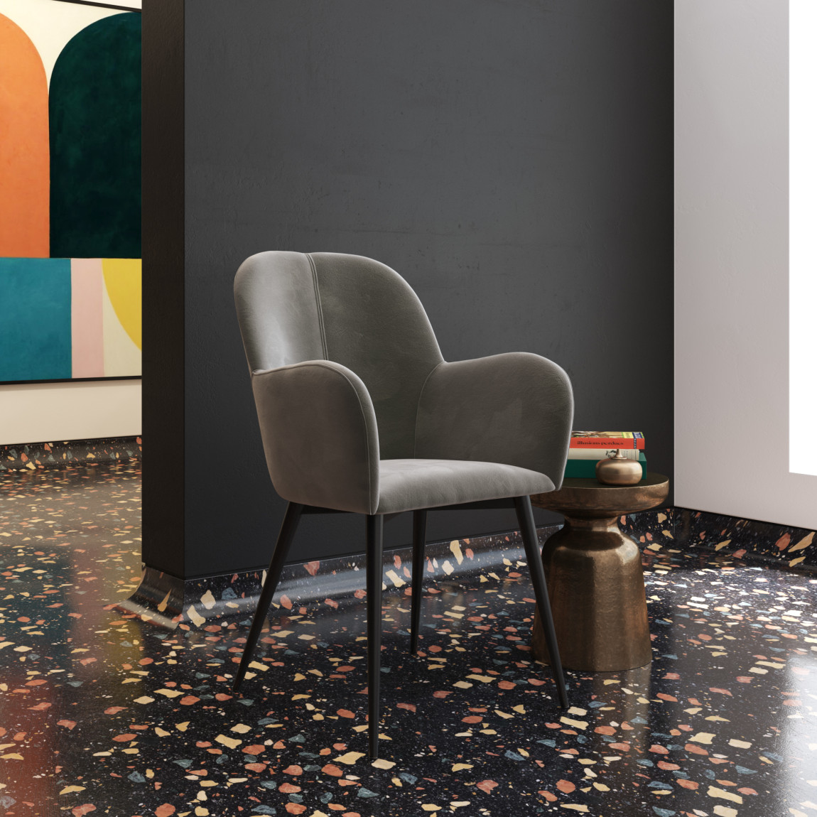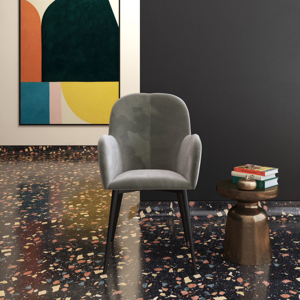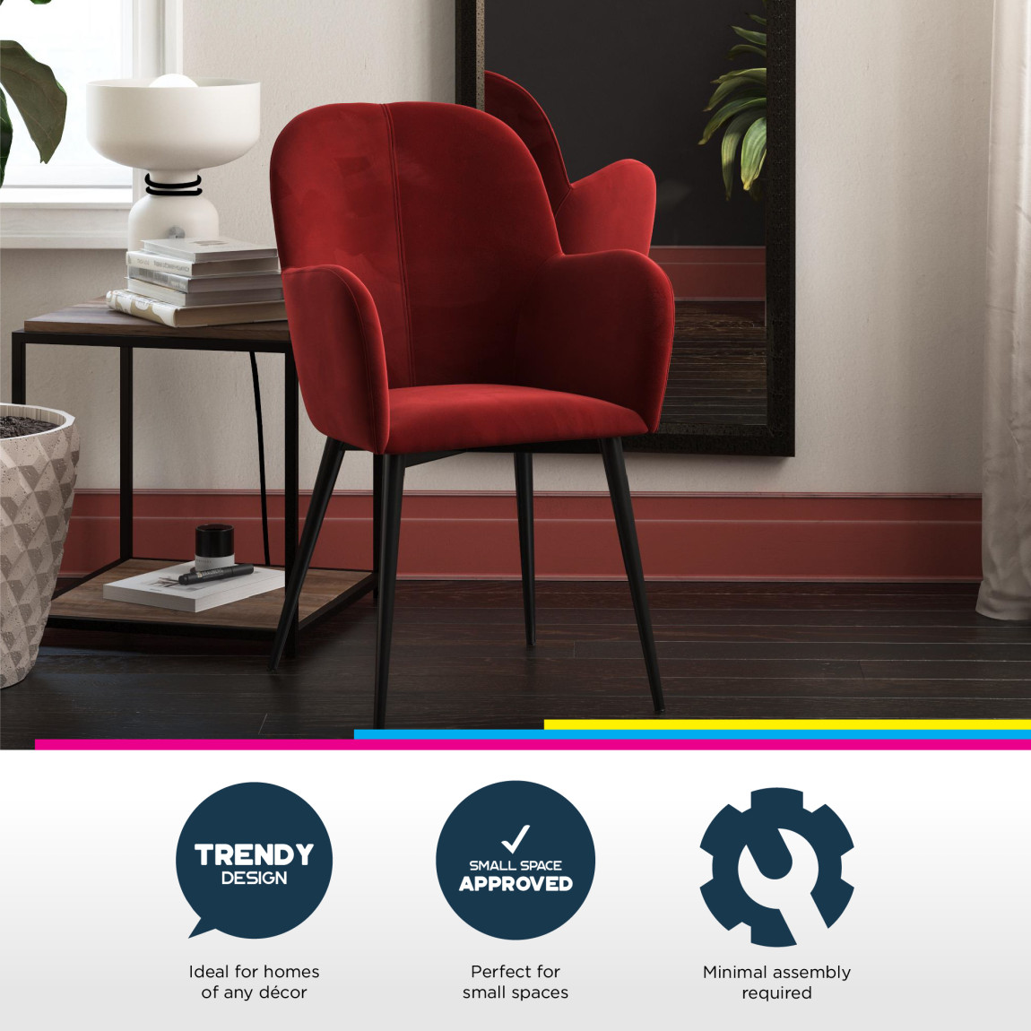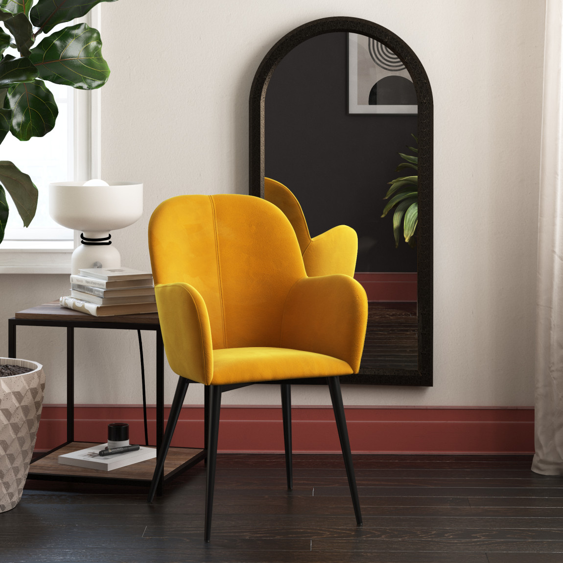 The Fitz Accent Chair is the perfect pop of color to brighten up your living room, bedroom or home office.Curved design upholstered in soft velvet that sits on sturdy black metal legs.