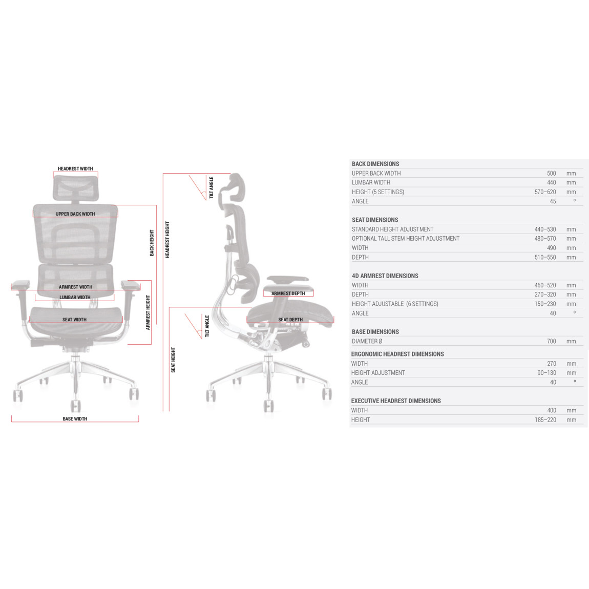 Back Height (5 settings): 570 - 620