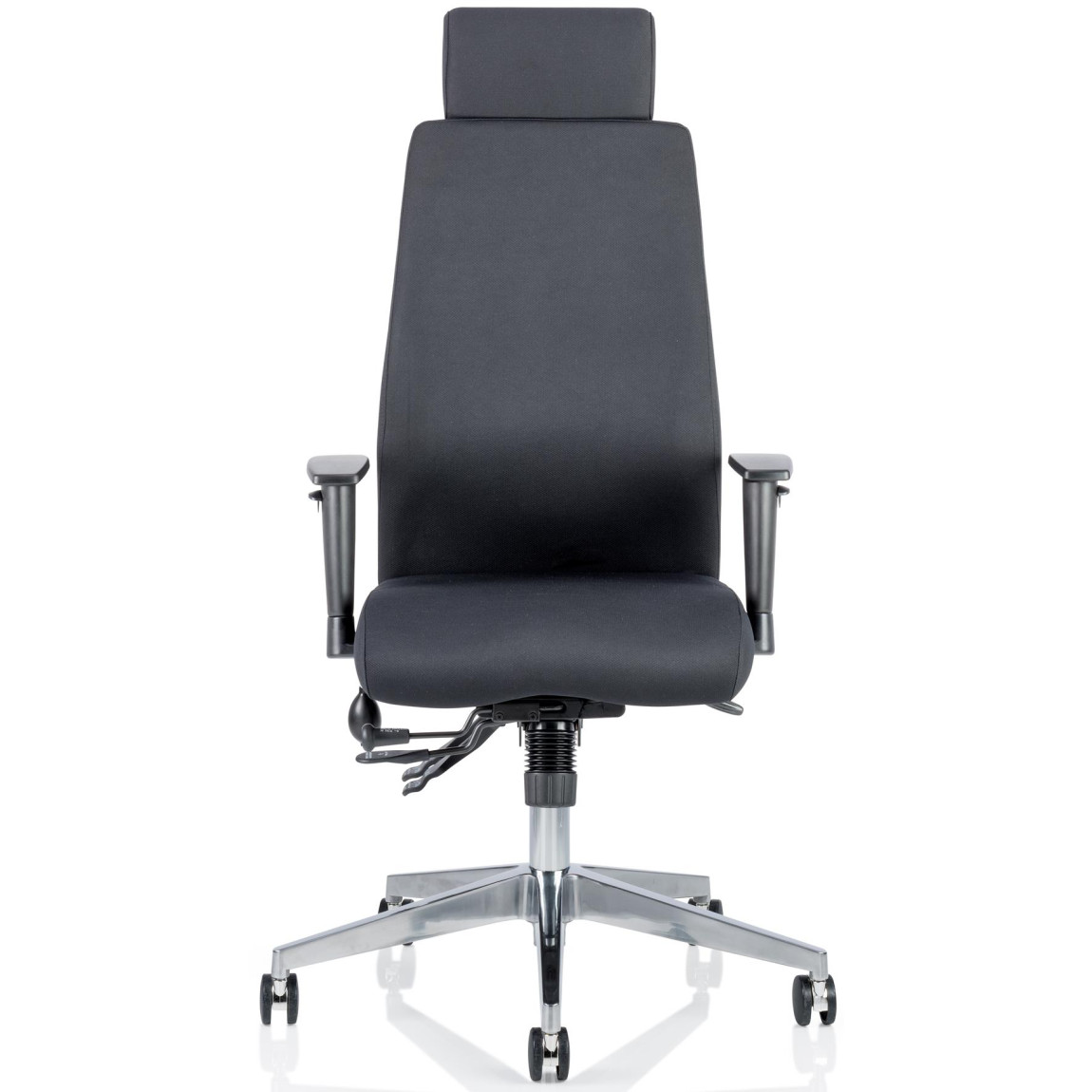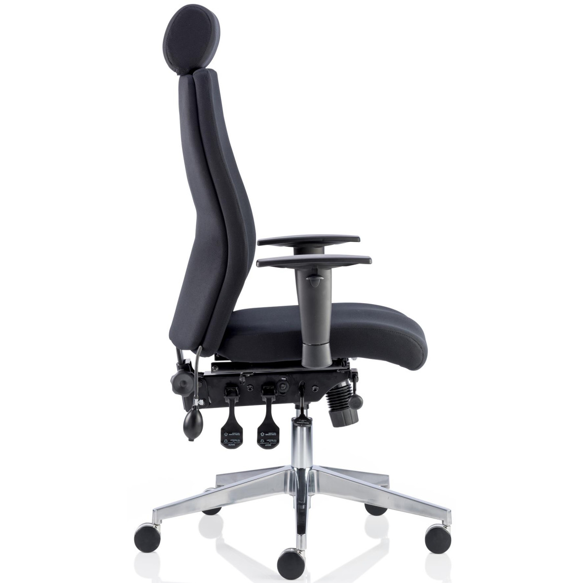 Tags: Ergonomic design, chiropractor-approved, posture support, multi-function mechanism, height adjustable, armrests, polished chrome base, black fabric, contoured foam seat and back, ergonomic headrest, 24-hour use, weight limit 23 stone, height adjustment, seat slide, seat tilt, back tilt, EN5459 standards, 5-year guarantee, fire retardant foam and fabric, office chair, desk chair