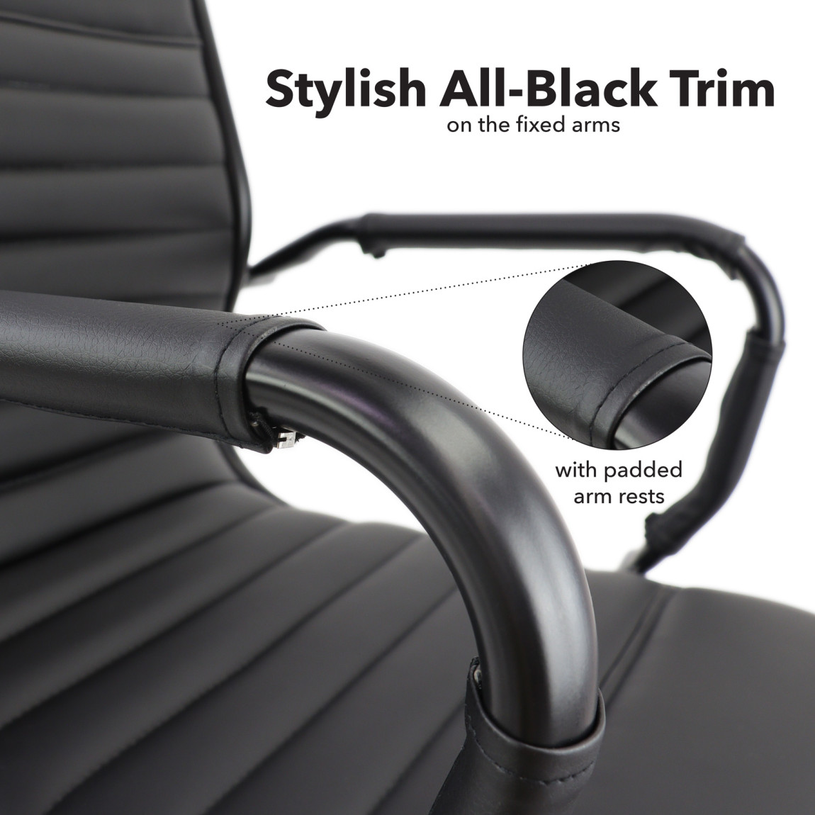 The chairs come in a classic black ribbed faux leather design and are available with either a high back or medium back. They are designed to offer utmost comfort to both employees and visitors with chrome arms and a sleek chrome base that adds to its stylish look.