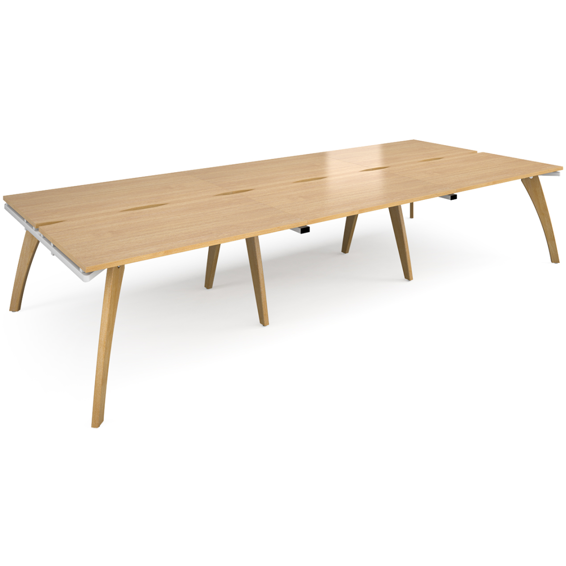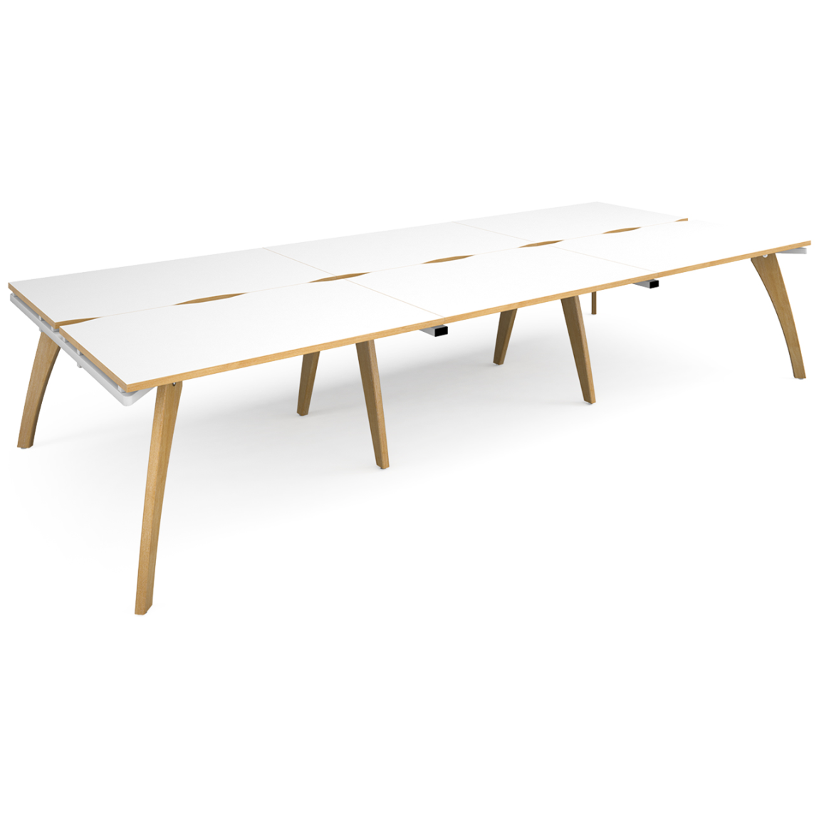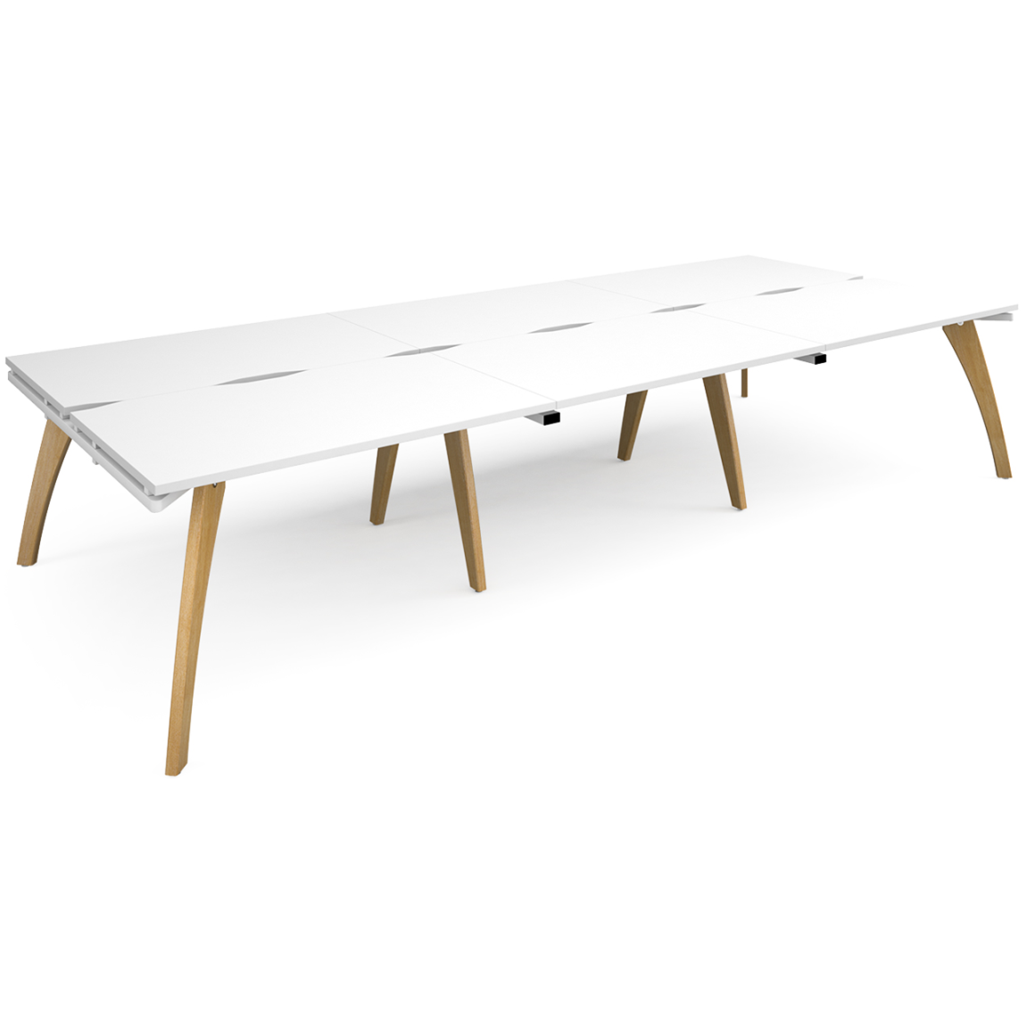The Fuze blends practicality and looks, creating a clean and modern modular desk range for your office. The Fuze desk can be used as a work space or as meeting tables. The Triple Back to Back Modular Desk compromises of six 800mm deep desk tops with scalloped cut outs, available in 3 width options (3600mm, 4200mm and 4800mm) with 25mm thick tops, solid oak legs, and are available in white or white with oak sides. As well as this, the Fuze desks are available with an 8 year guarantee and a range of delivery options.