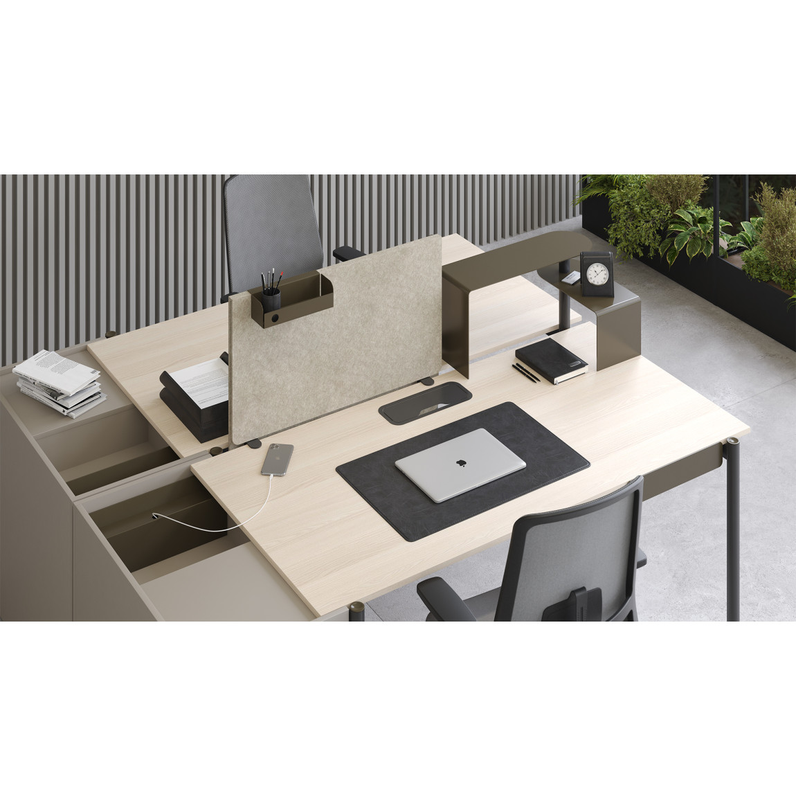 Thanks to digital technology, a modern workplace is becoming less cluttered and no longer requires many cabinets. Minimalist drawers and open niches with a PET felt lining are perfect for such a case. All the accessories of ZEDO desk collection - drawers, shelves and power units - maintain the continuity of metal colour combinations and functionality.