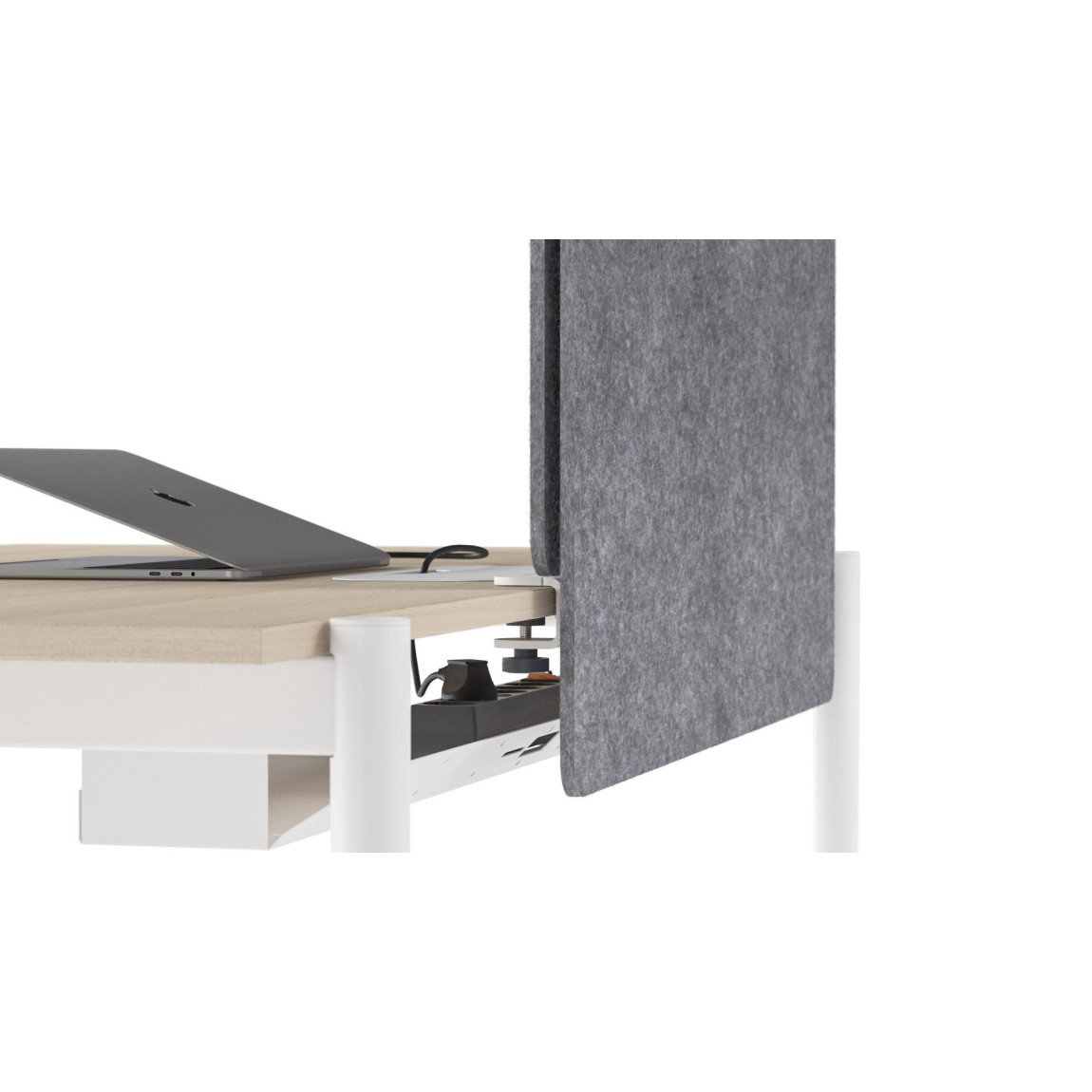 Non-typical felt sheet bending totally hides its supporting structure, while the extended edge covers the cable tray and wires. This way a workplace looks neat and aesthetic.