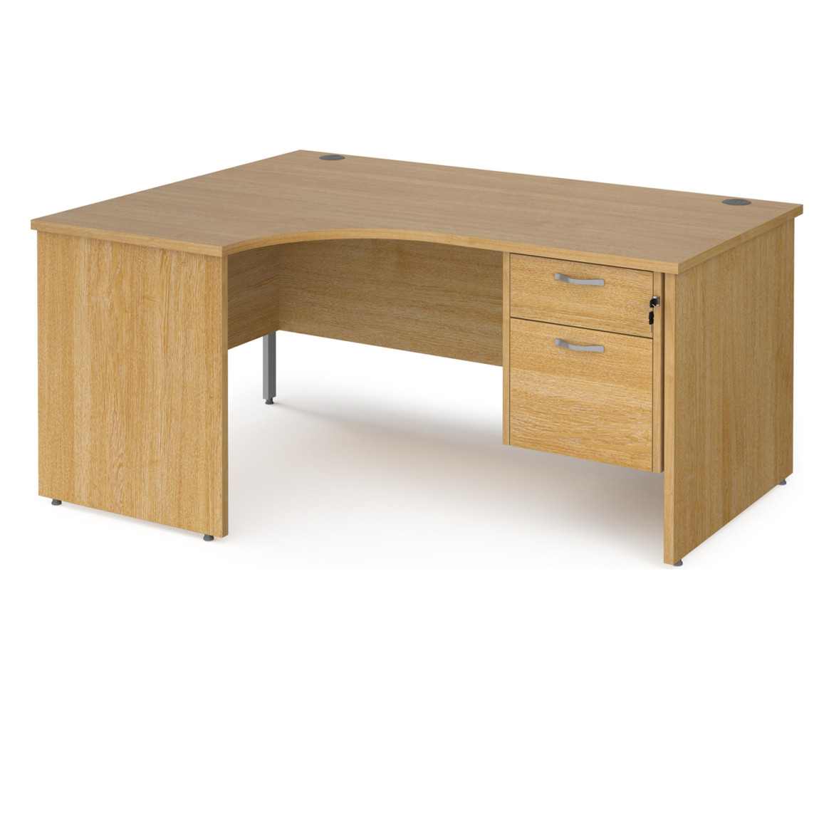 - Modern 1600mm left and right hand ergonomic desk with panel end legs and 2 drawer pedestal.