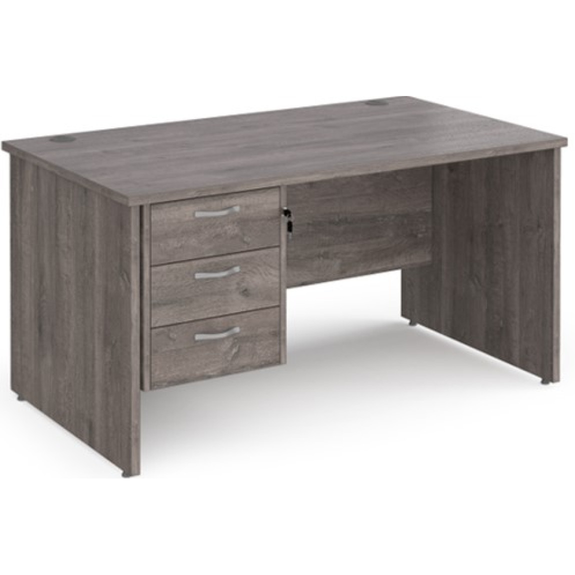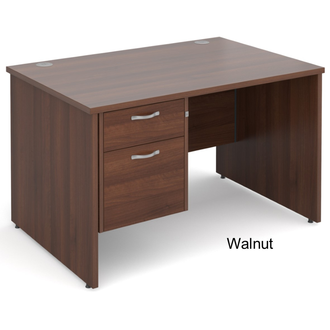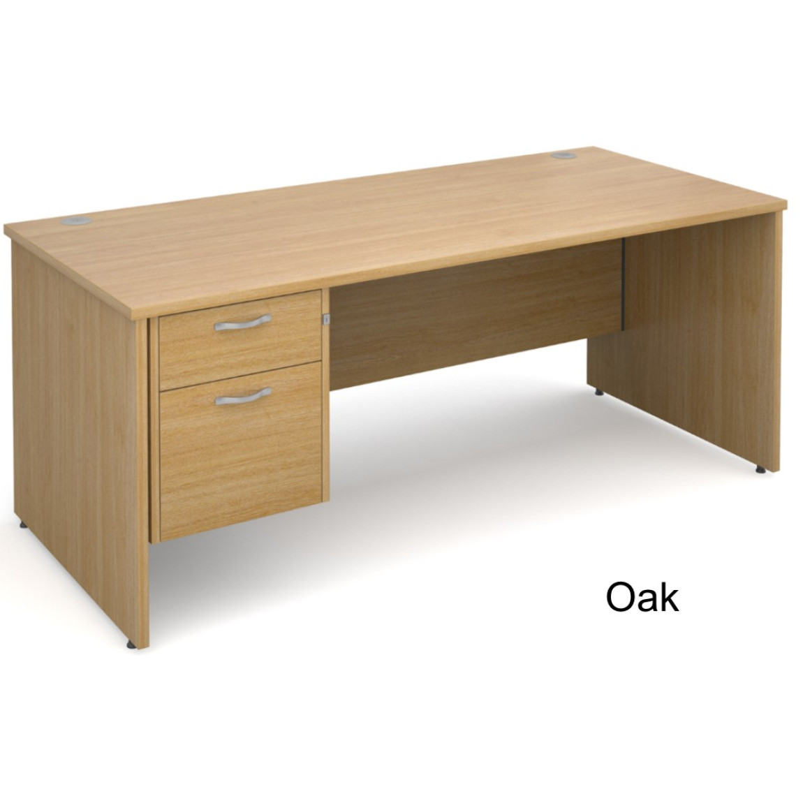 The Maestro Straight Office Desk features a traditional panel end leg design and is ideal for any office space, it is available in a range of 5 colours as well as 4 width options (1200mm, 1400mm, 1600mm or 1800mm) and features a heat and stain resistant MFC. The Maestro Desk features 25mm tops as well as the thick 25mm panel end frame, 2 cable ports, an 18mm thick modesty panel and feet levelers. The Maestro Desk also comes with either a 2 drawer pedestal which offers 1x shallow drawer and 1x filing drawer (which accepts both A4 and Foolscap Files) or a 3 Drawer Fixed Pedestal which offers 3x shallow stationary drawers. The Maestro Straight Desk also features Silver Handles on the fixed pedestal which helps with the coordinated look of this desk.