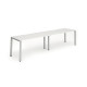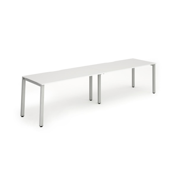 The Evolve Two Row Desk is part of the Evolve Bench Desking Range. It is available in Beech, Maple, Grey Oak, Oak, Walnut and White as well as this, the Evolve Two Row Desk is available with a choice of 2 frame colours. The Evolve Desk is available in 3 width options (2400mm, 2800mm and 3200mm), features a scalloped back, 2mm protective edging, 25mm thick tops, a powder coated frame available in either silver or white, height adjusting floor levellers and space saving column legs.