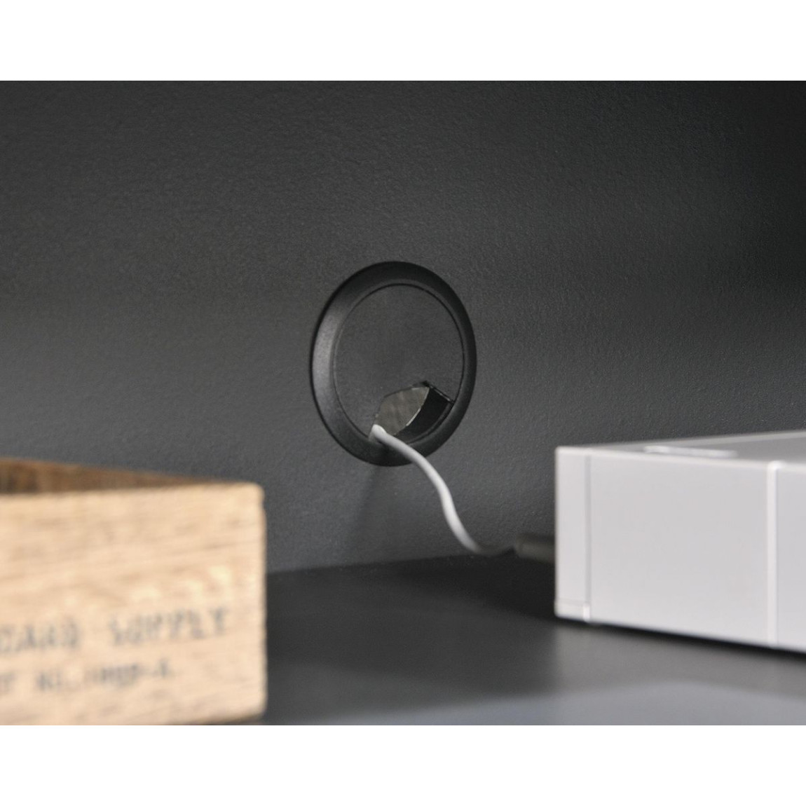 Enclosed back with 'pass-through' opening for discreet cable management