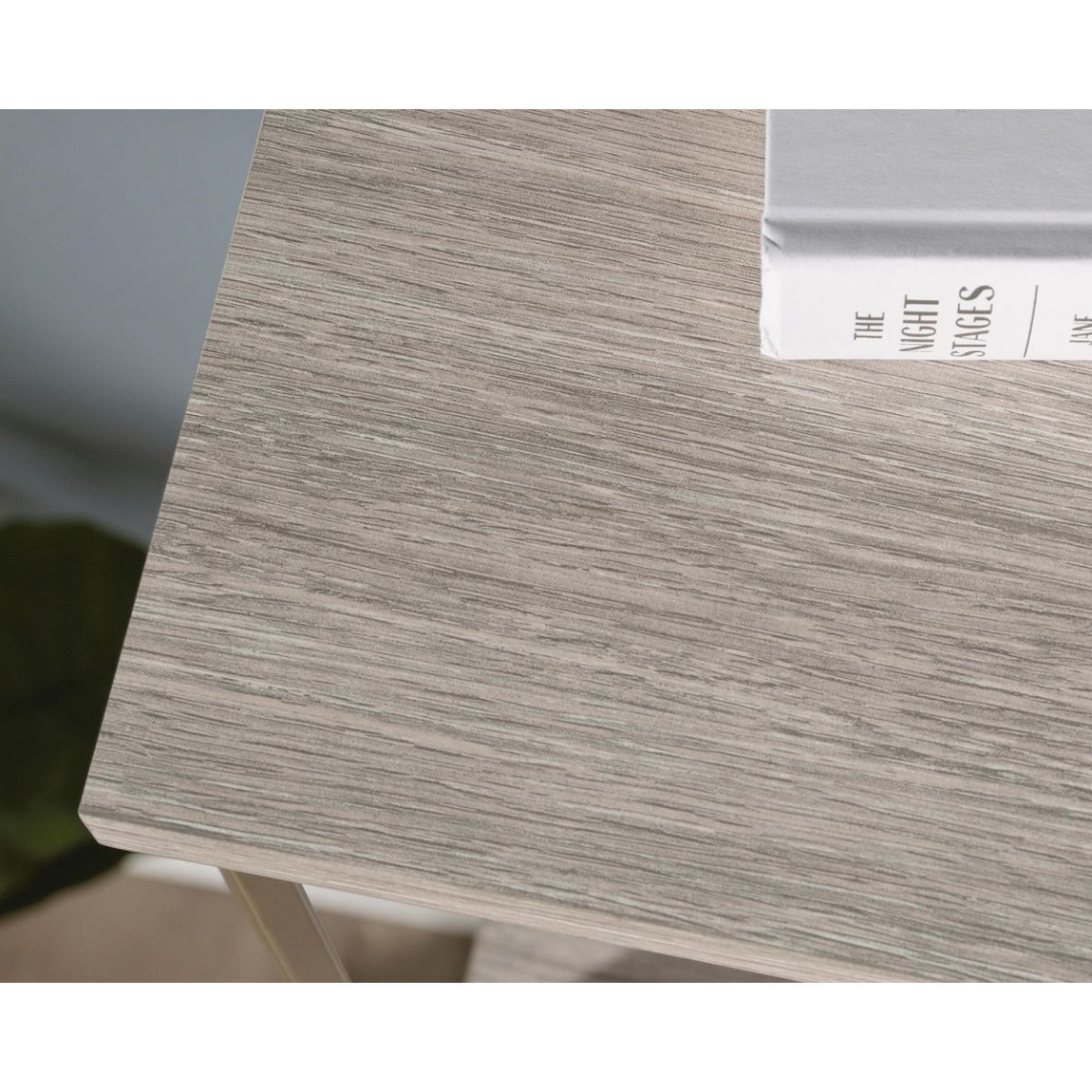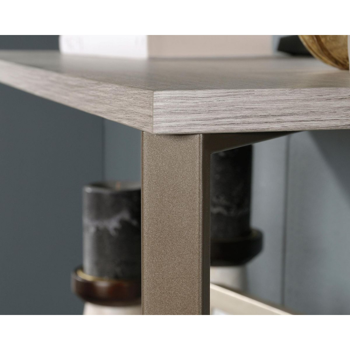 - Home office desk in Champagne Oak finish- Durable, satin taupe metal frame- Generous working area-..