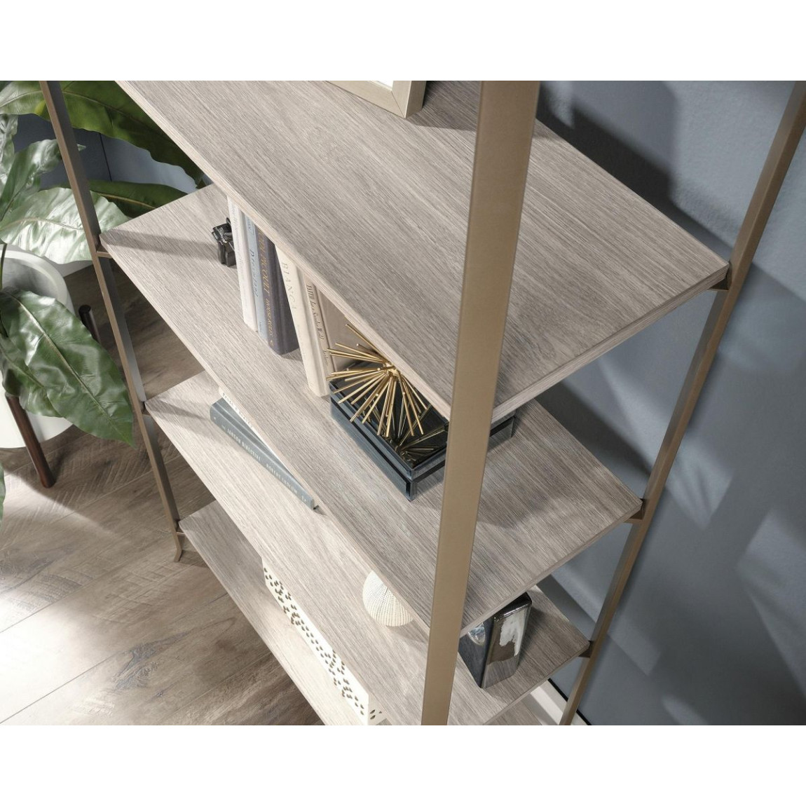 Five shelf bookcase in Champagne Oak finishSimple, sleek designOpen, spacious wood shelving to displ..
