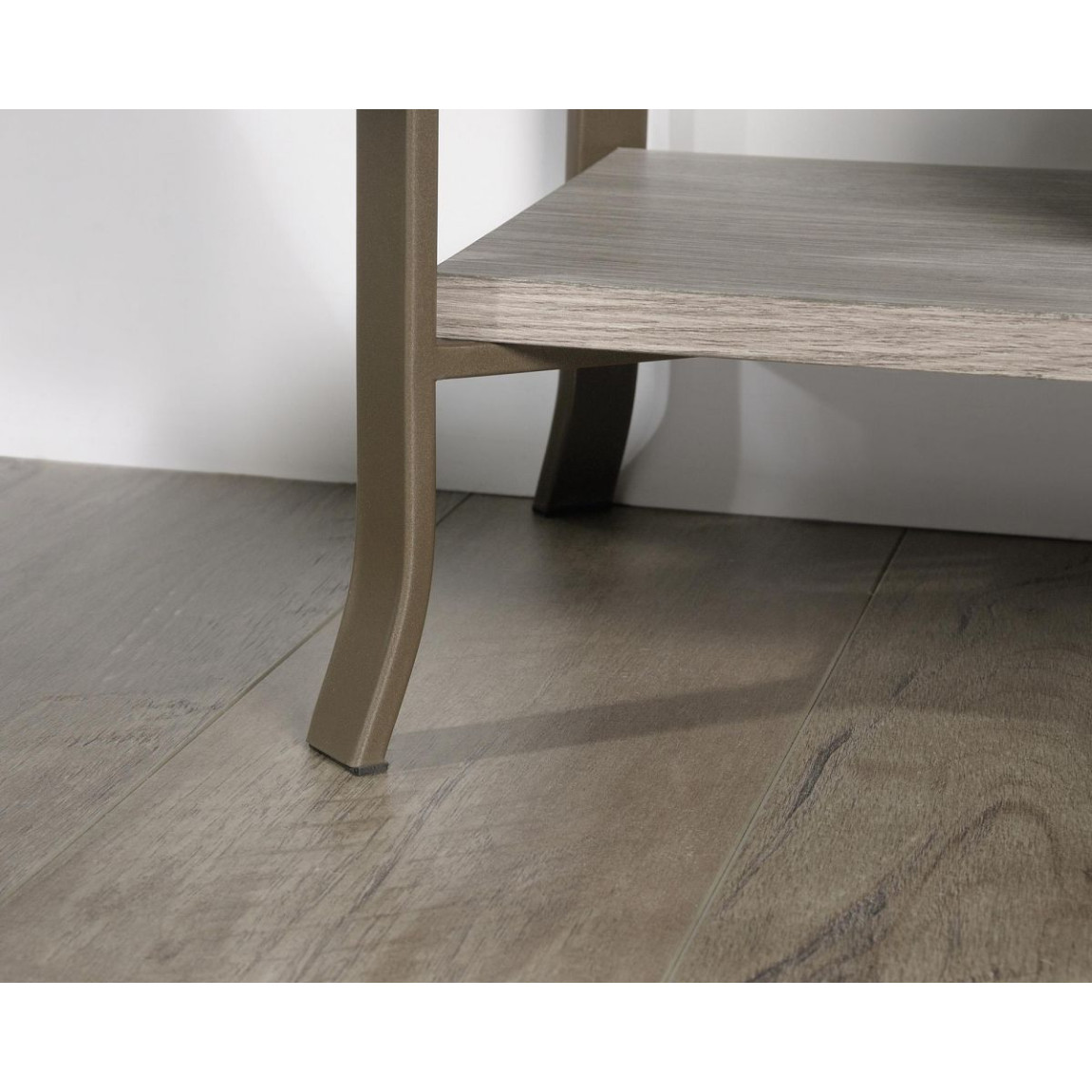 Cabinet with sliding door in a Champagne Oak finishSatin taupe metal feetSafety-tempered glass topTw..