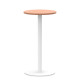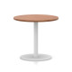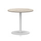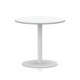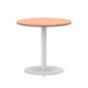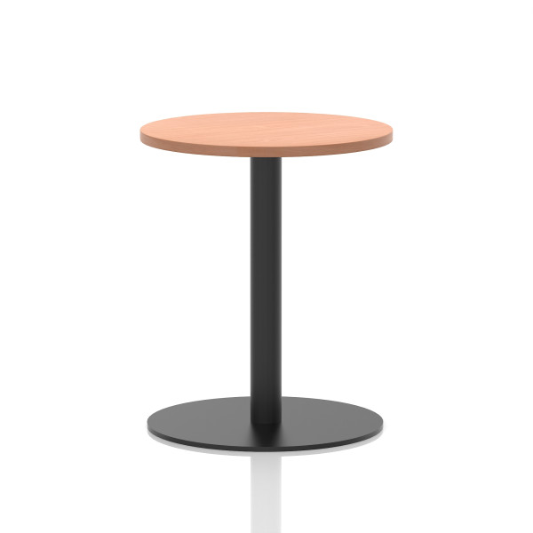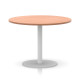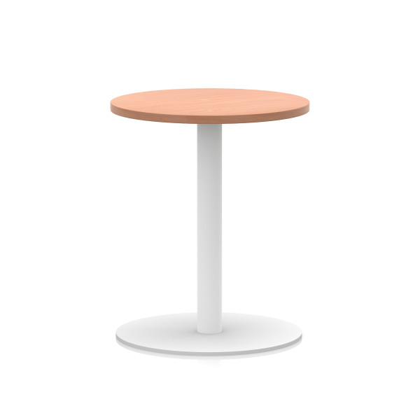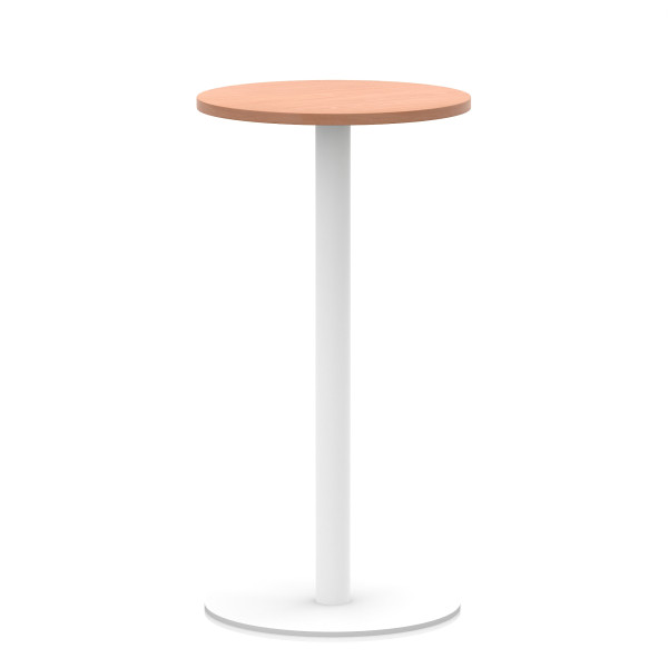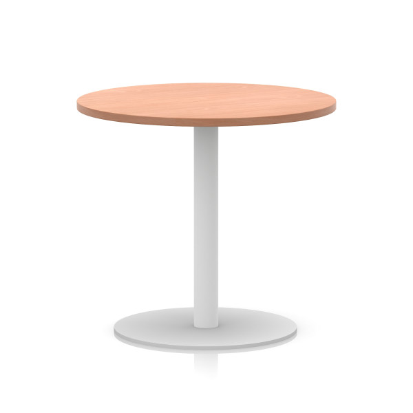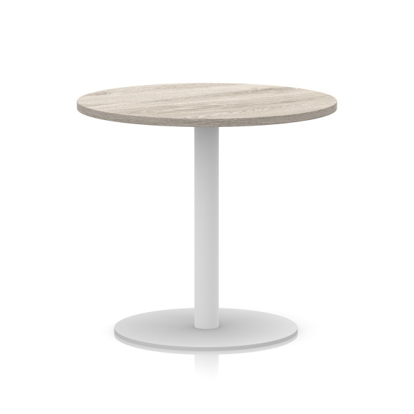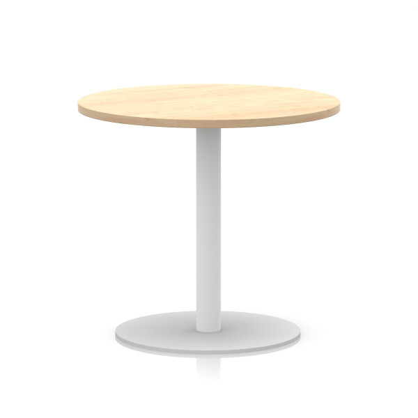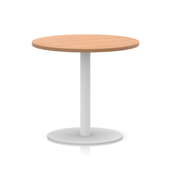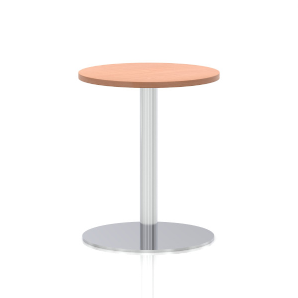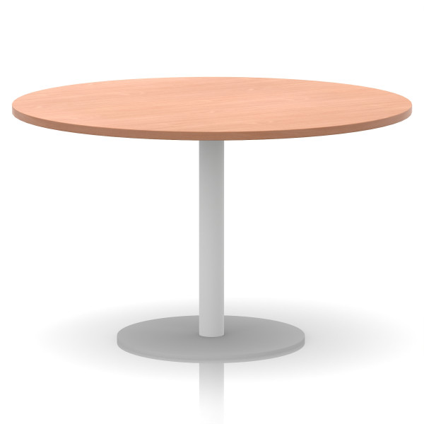 25mm thick desktop profile, brushed stainless steel effect circular base (580mm diameter), brushed stainless steel pillars (76mm diameter), weighted base provides stability, two part bolted frame system.