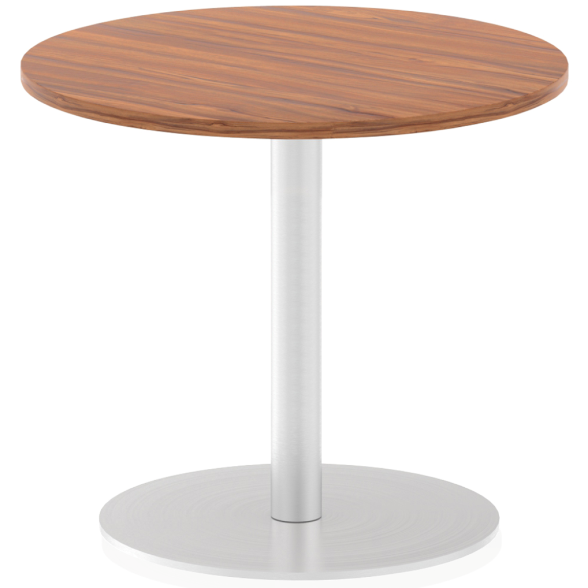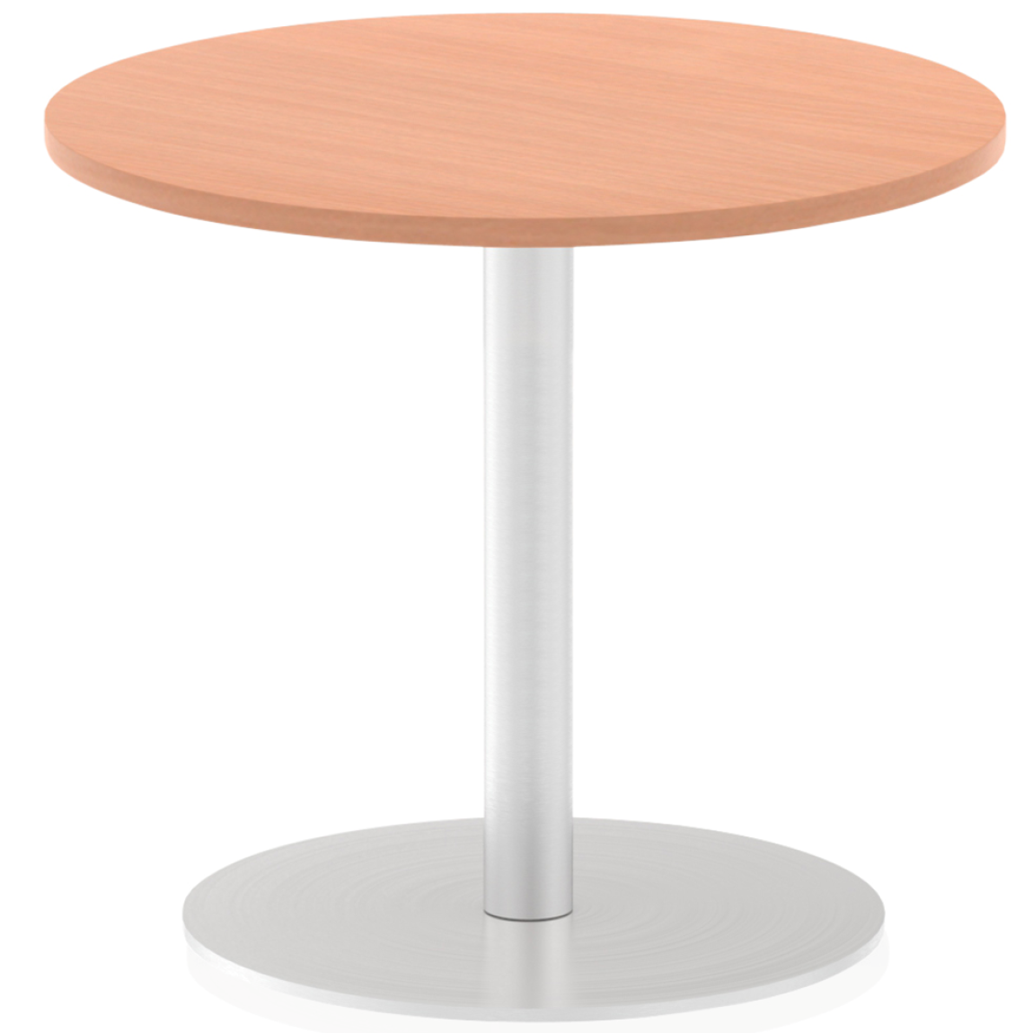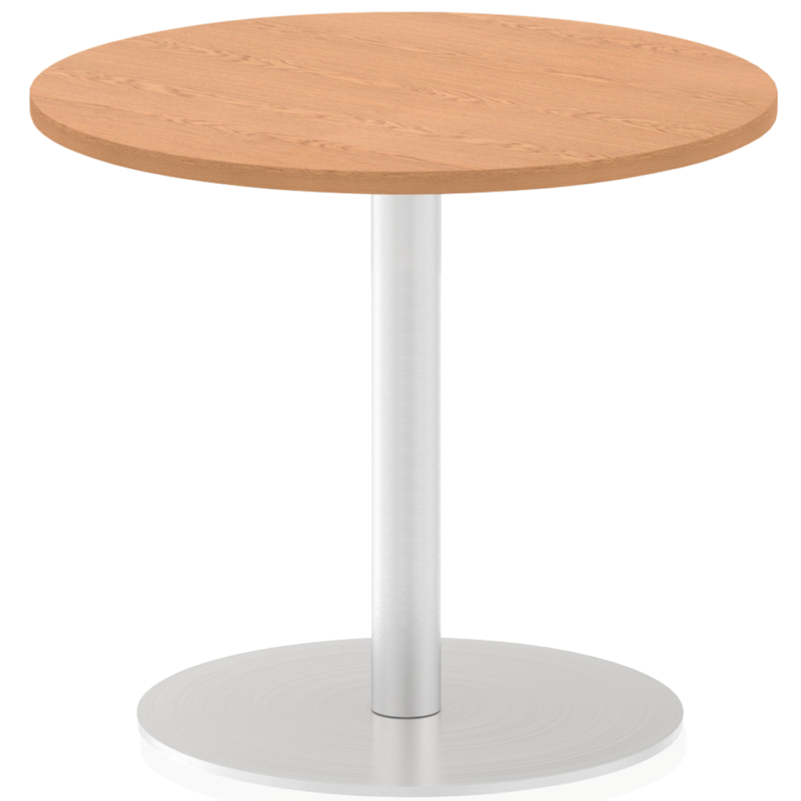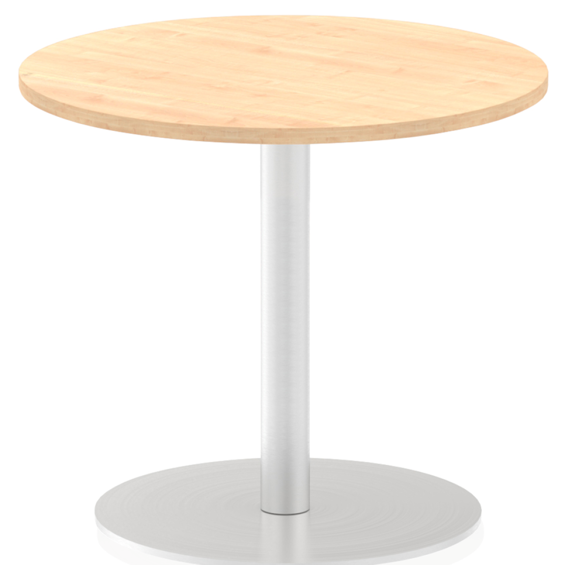 25mm thick desktop profile, brushed stainless steel effect circular base (580mm diameter), brushed stainless steel pillars (76mm diameter), the weighted base provides stability, two part bolted frame system.