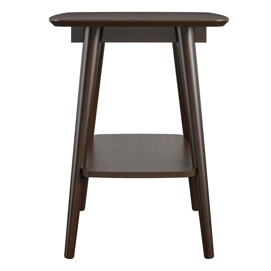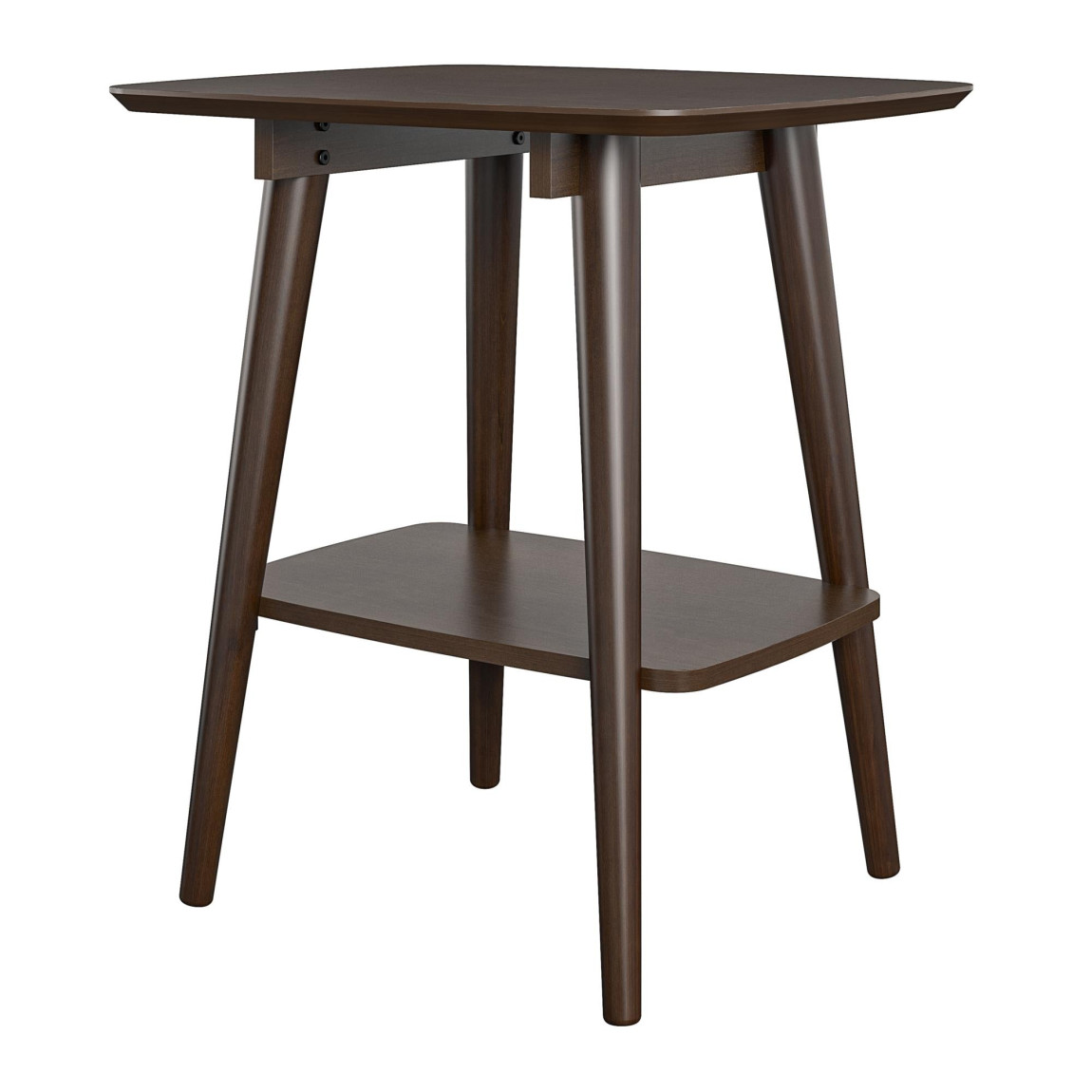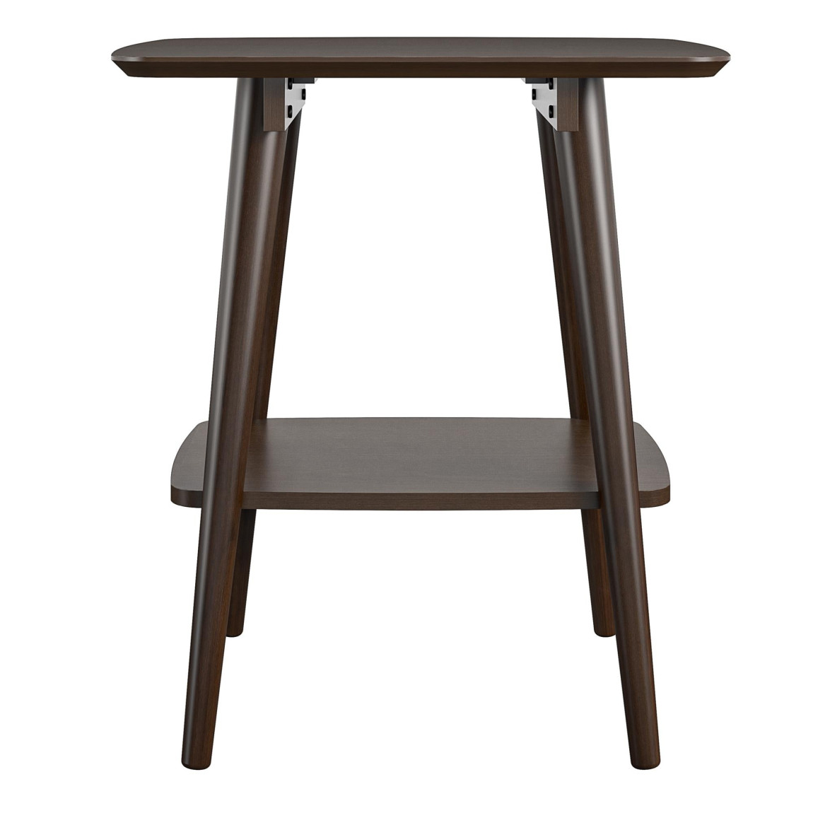 Complete your living room with the Novogratz Brittany End Table. The beautiful walnut finish on wood veneer gives the look and feel of real wood and pairs with the angled real wood legs for a trendy mid-century modern look. The square table top can hold your coasters, snacks and electronics and features a rounded edge to add to the mid-century modern charm. The lower shelf can organize books and magazines to keep your table top clutter free. The End Table ships flat to your door and requires assembly upon opening. Two adults are recommended to assemble. Once assembled, the End Table measures to be 23.625”H x 21.625”W x 18.75”D.