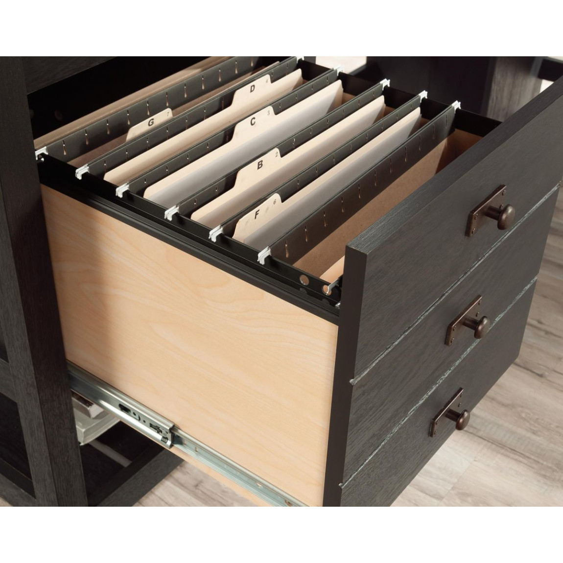 Lower filing drawer holds letter size hanging files