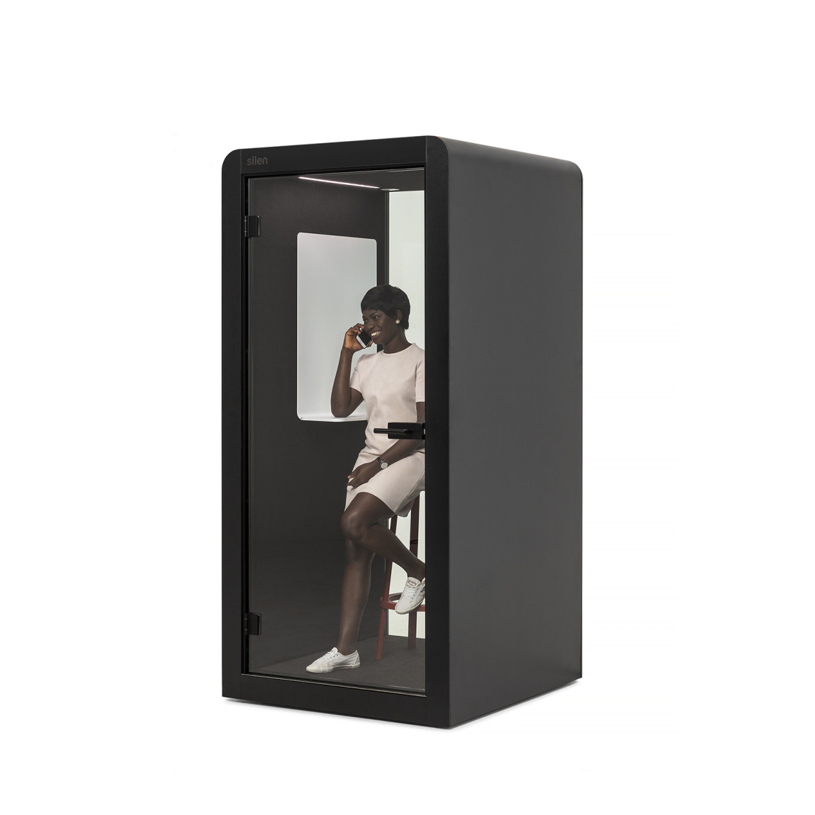 Privacy can be difficult to find in a modern, open plan office. Silen 1 puts your workspace to most efficient use by creating an island of silence in an open office. The phone booth has one of the largest interior footprints on the market, featuring a built-in laptop table with a ferrous metal back, this acoustic pod is perfect for individual work and phone calls.