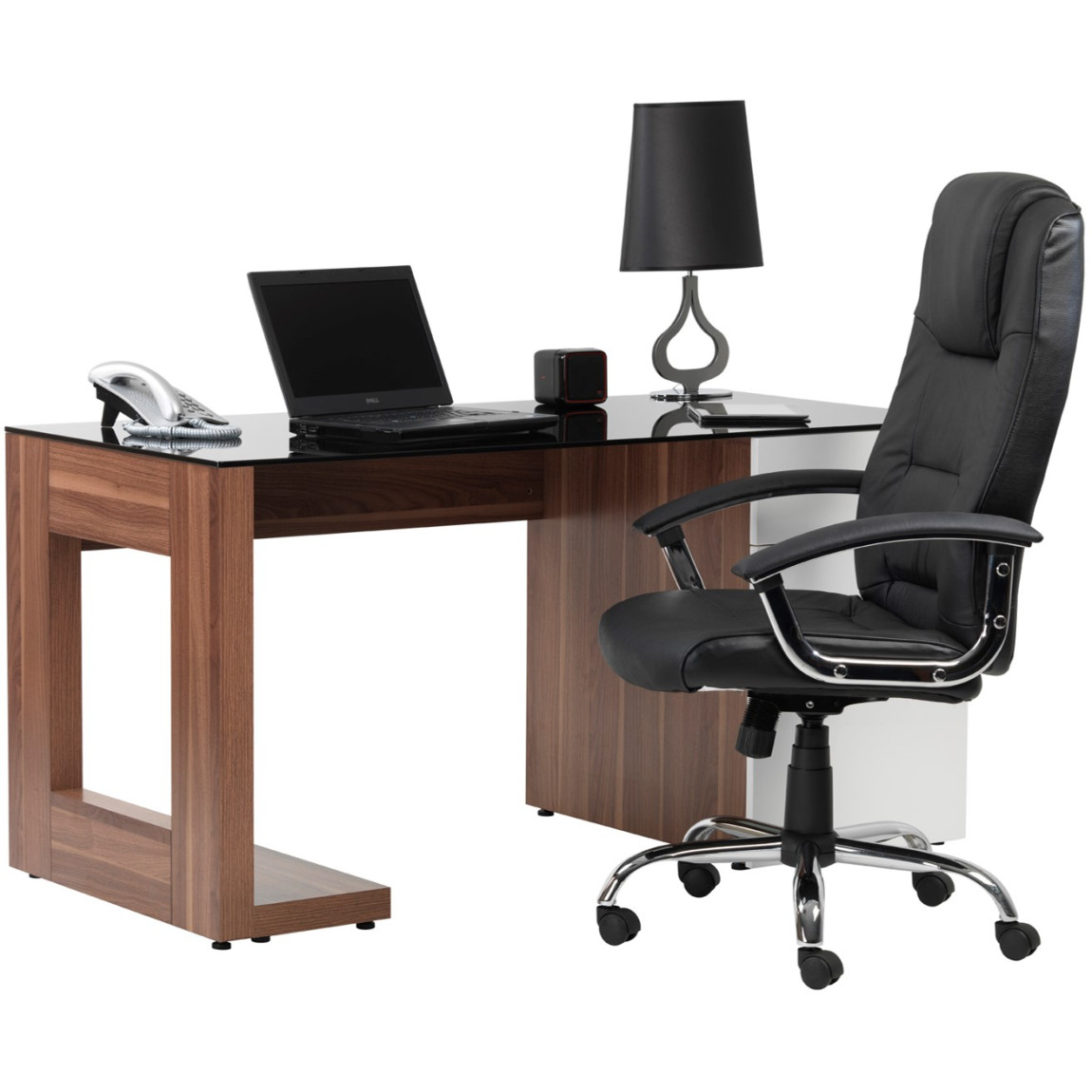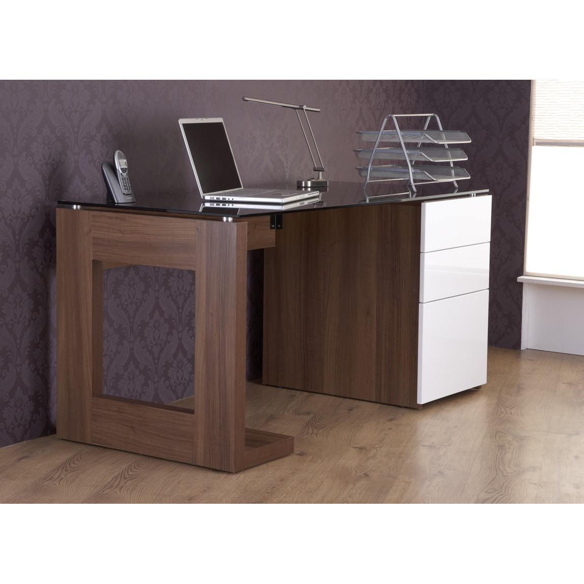 which features a tempered glass desk top as well as a high gloss, white finish