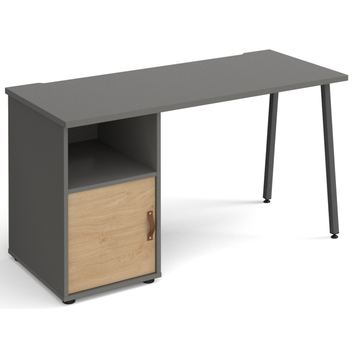 The Sparta desk is the ideal combination between fine workmanship and reliable materials. The A-frame in charcoal grey is made of of highly durable steel for exceptional stability and support over the long haul, with ample legroom to keep you comfortable and move about. Together with the matching storage legs and shelf brackets, the simple lines and subtle industrial style will give a contemporary twist to any home and working space.