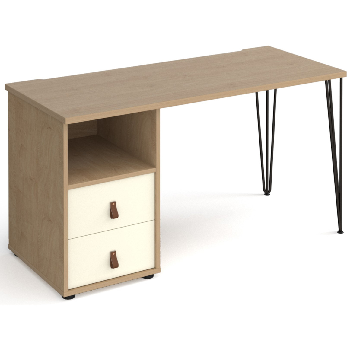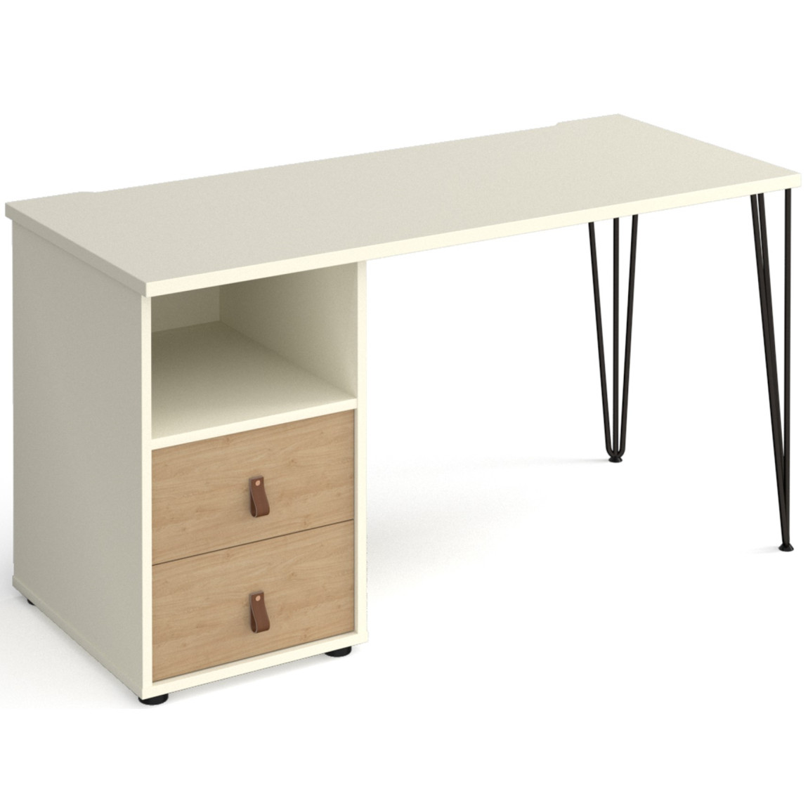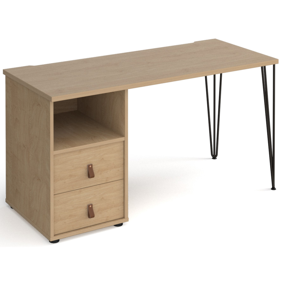 Give your workspace a mid-century modern upgrade with the Tikal workstation with black hairpin legs, which will add both stability and style to any home furniture setting. Available with triple slimline rods, the hairpin legs sit at a reclined angle in each corner oof the desktop, complemented by matching hairpin feet for the wooden storage unit and chic shelf brackets.