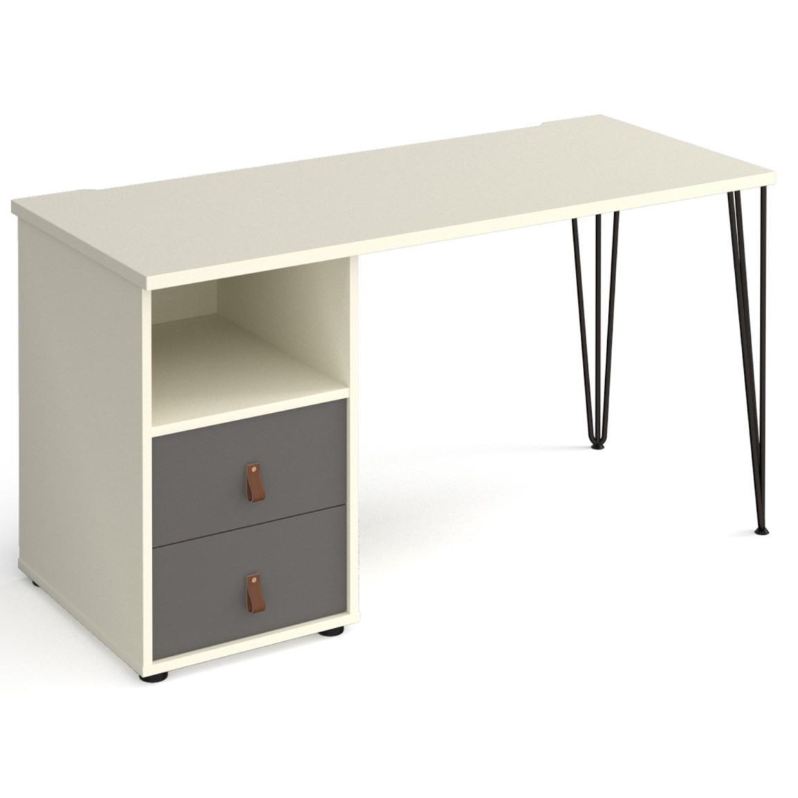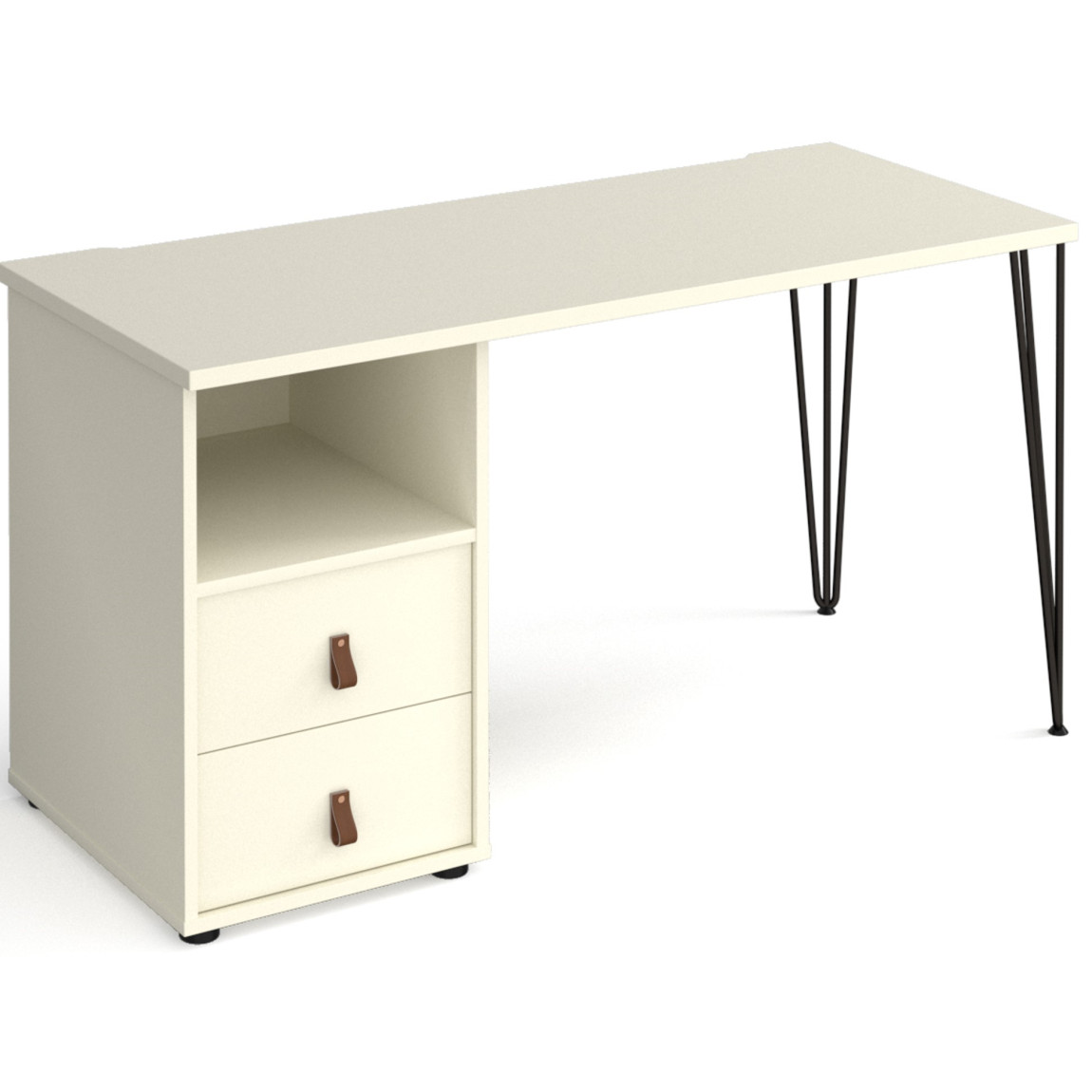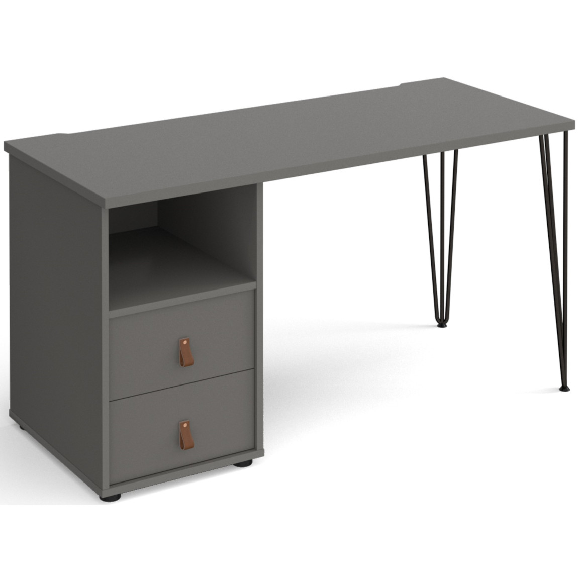 Give your workspace a mid-century modern upgrade with the Tikal workstation with black hairpin legs, which will add both stability and style to any home furniture setting. Available with triple slimline rods, the hairpin legs sit at a reclined angle in each corner oof the desktop, complemented by matching hairpin feet for the wooden storage unit and chic shelf brackets.