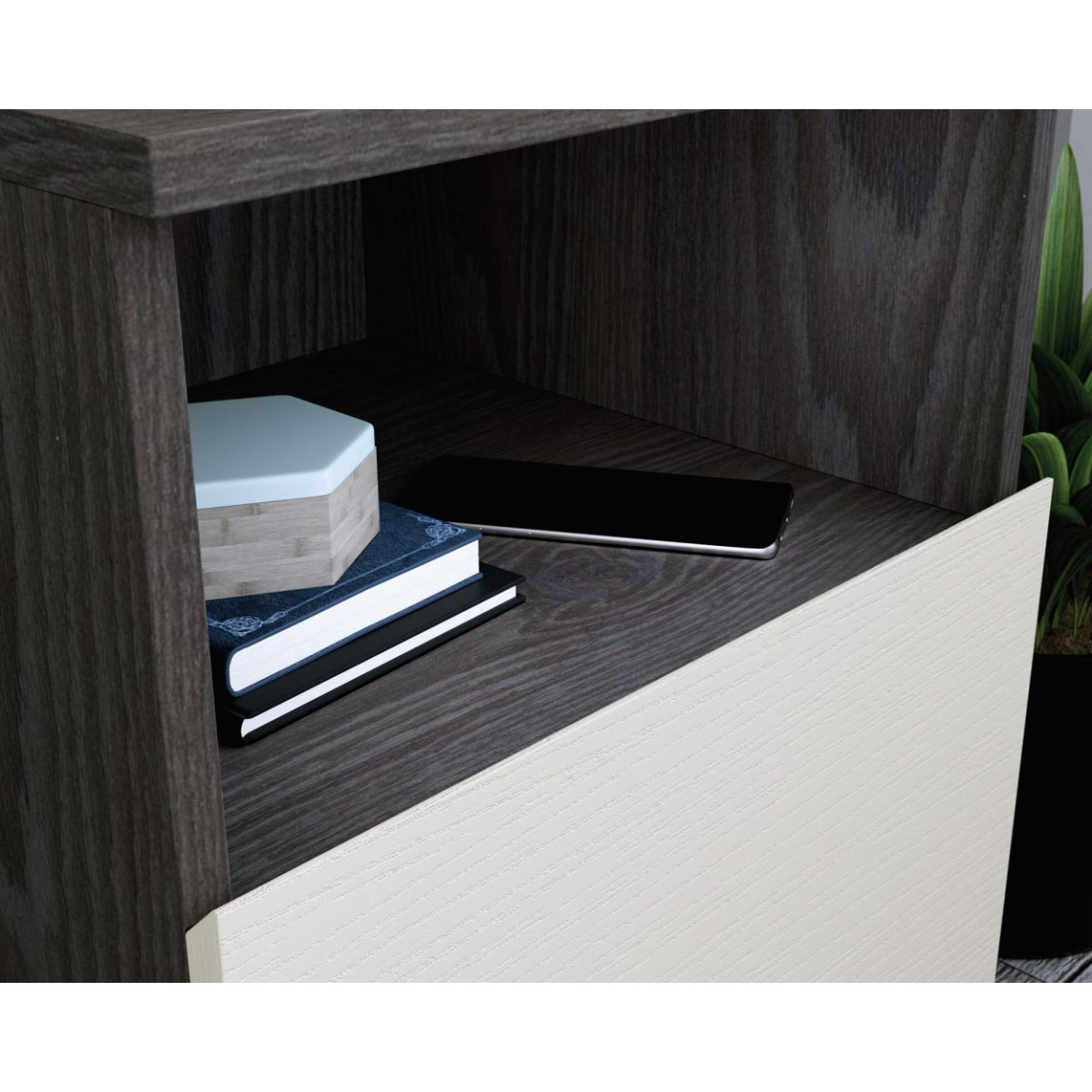 Contemporary bedside night stand in Charcoal Ash finish with Pearl Oak accents